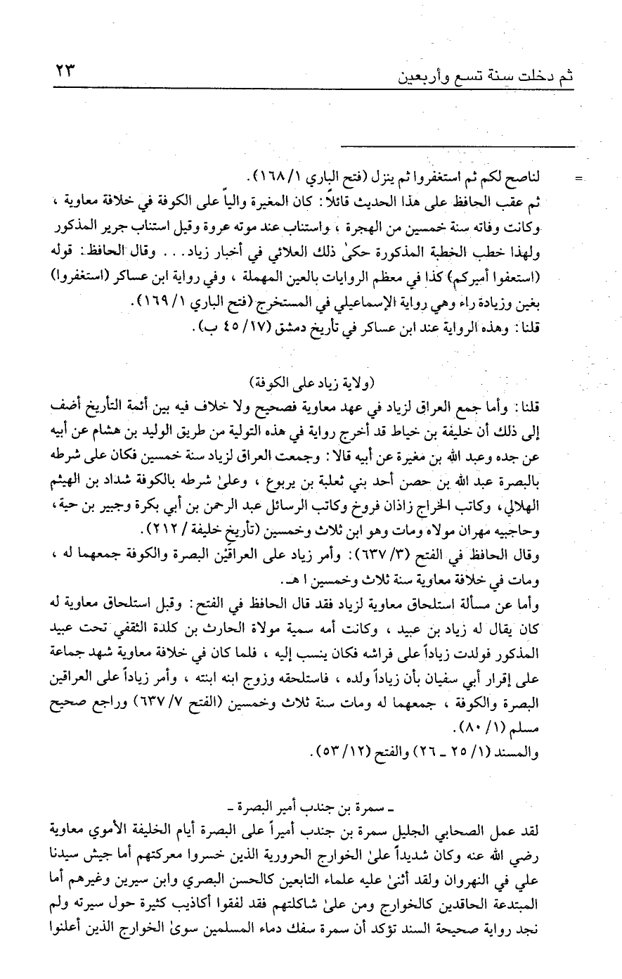 وقال الحافظ في الفتح (٣/ ٦٣٧): وأمر زياد على العراقَيْن البصرة والكوفة جمعهما له، ومات في خلافة معاوية سنة ثلاث وخمسين اهـ.