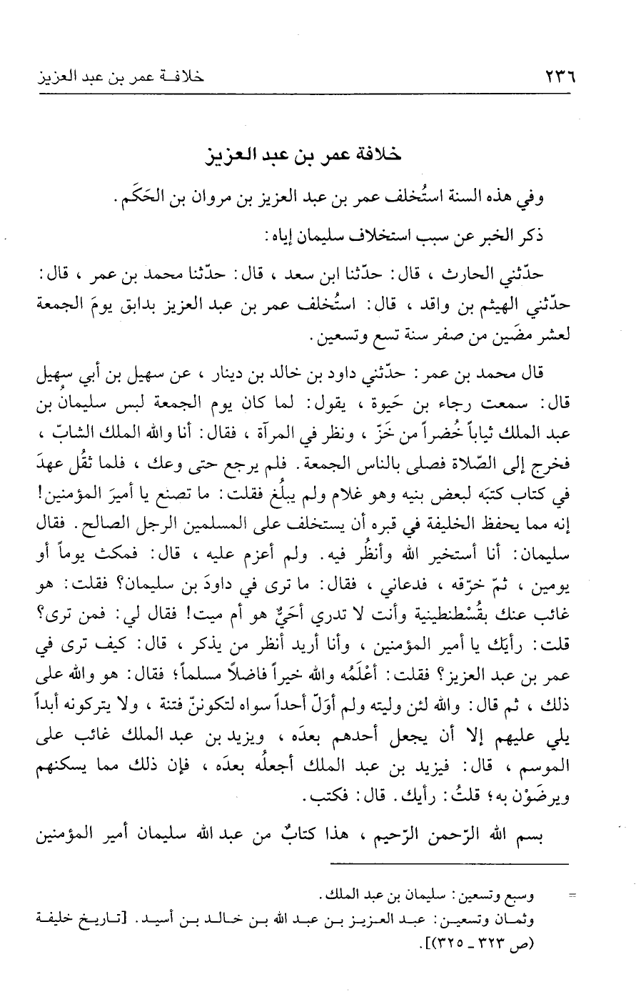 حدّثني الحارث، قال: حدَّثنا ابن سعد، قال: حدَّثنا محمد بن عمر، قال: حدّثني الهيثم بن واقد، قال: استُخلف عمر بن عبد العزيز بدابق يومَ الجمعة لعشر مضَين من صفر سنة تسع وتسعين.