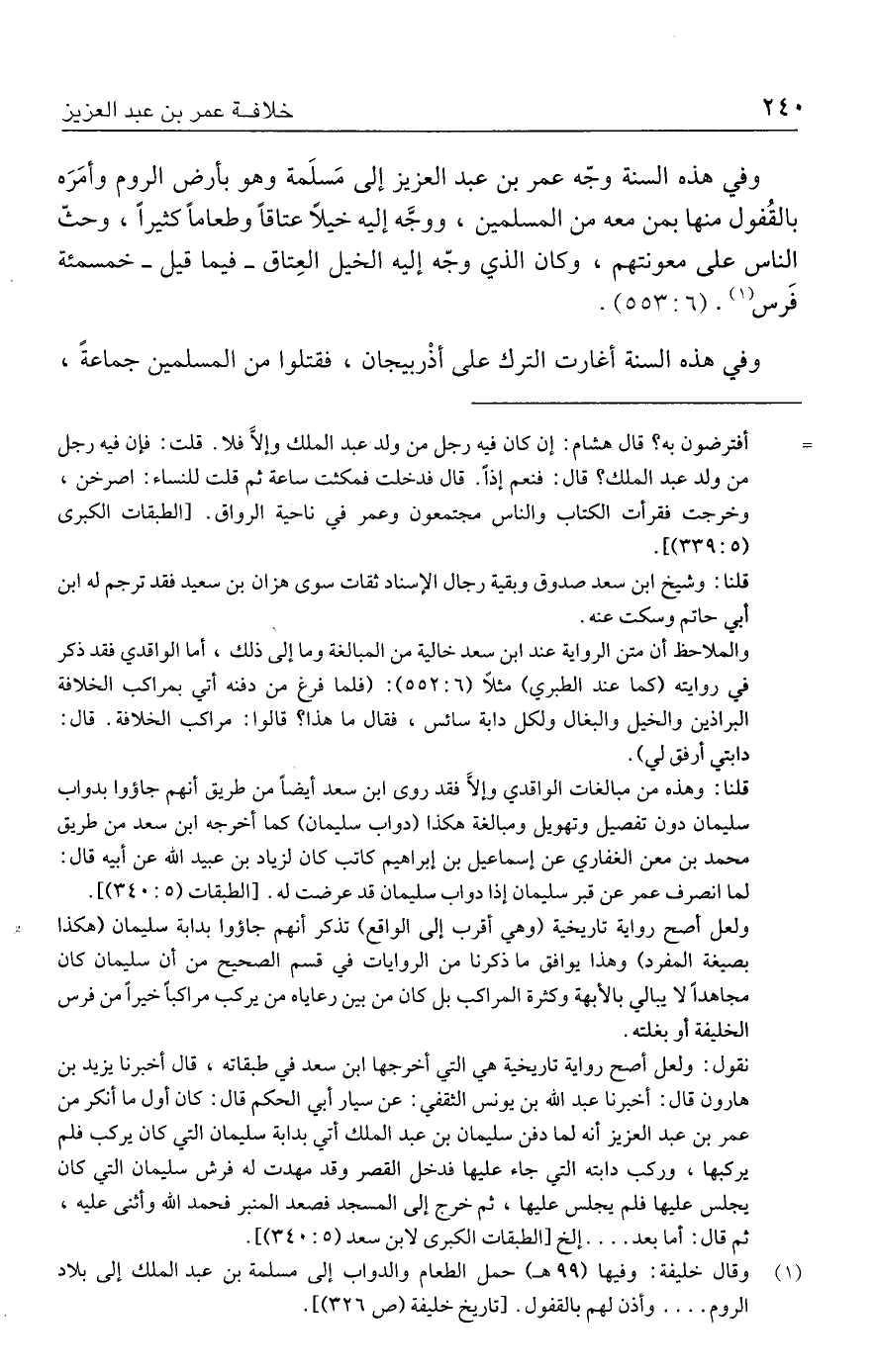 والملاحظ أن متن الرواية عند ابن سعد خالية من المبالغة وما إلى ذلك، أما الواقدي فقد ذكر في روايته (كما عند الطبري) مثلًا (٦: ٥٥٢): (فلما فرغ من دفنه أتي بمراكب الخلافة البراذين والخيل والبغال ولكل دابة سائس، فقال ما هذا؟ قالوا: مراكب الخلافة. قال: دابتي أرفق لي).