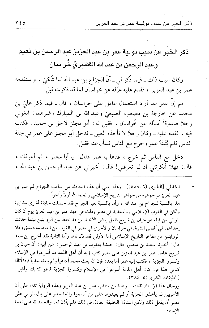 = الكابلي [الطبري (٥٥٨: ٦)]. وهذا يعني أن هذه الحادثة من مناقب الجراح ثم عمر بن عبد العزيز ثم جوهرة من جواهر التاريخ الإسلامي والحمد لله أولًا وآخرًا.