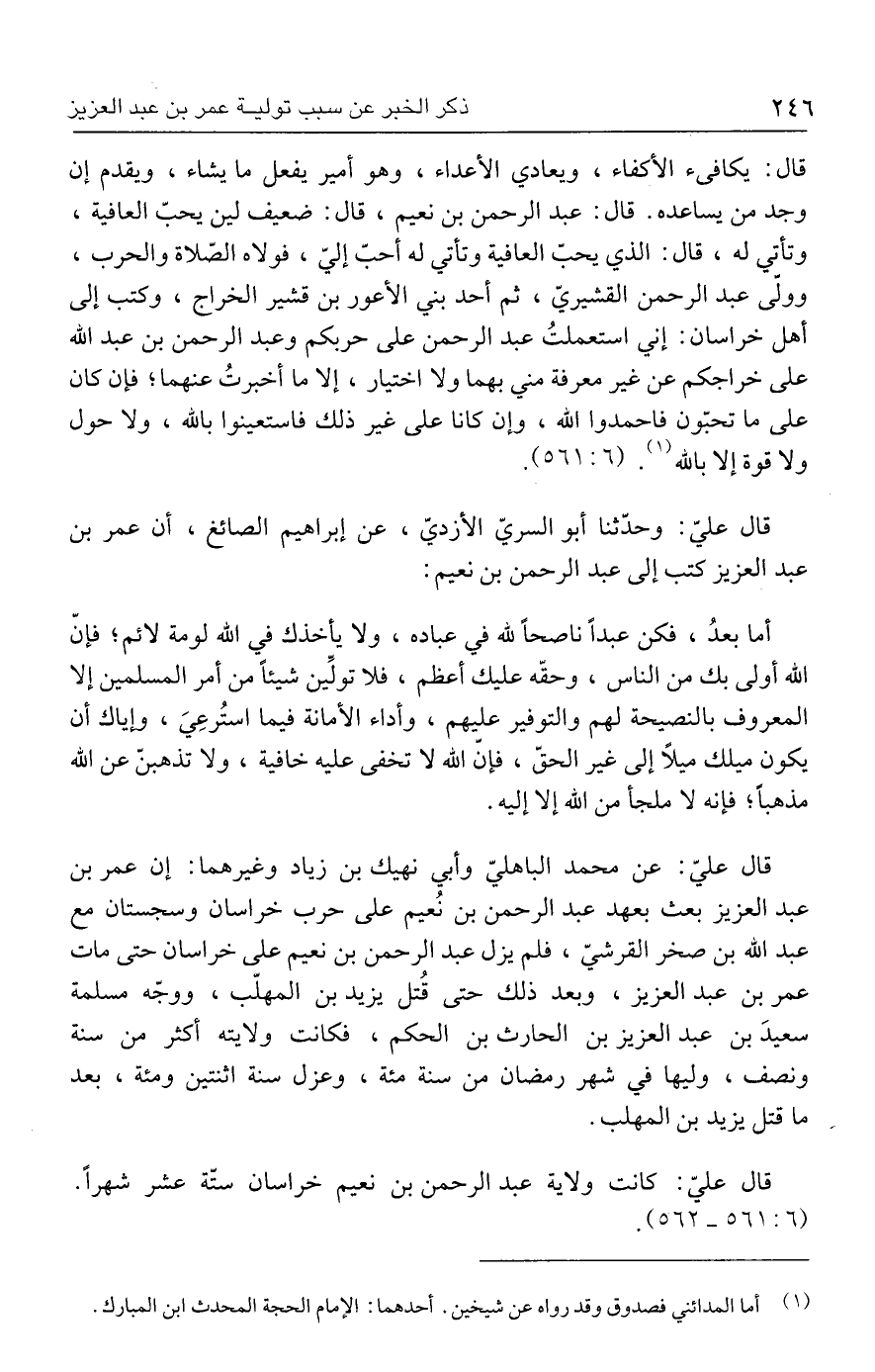 قال: يكافئ الأكفاء، ويعادي الأعداء، وهو أمير يفعل ما يشاء، ويقدم إن وجد من يساعده. قال: عبد الرحمن بن نعيم، قال: ضعيف لين يحبّ العافية، وتأتي له، قال: الذي يحبّ العافية وتأتي له أحبّ إليّ، فولاه الصّلاة والحرب، وولّى عبد الرحمن القشيريّ، ثم أحد بني الأعور بن قشير الخراج، وكتب إلى أهل خراسان: إني استعملتُ عبد الرحمن على حربكم وعبد الرحمن بن عبد الله على خراجكم عن غير معرفة مني بهما ولا اختيار، إلا ما أخبرتُ عنهما؛ فإن كان على ما تحبّون فاحمدوا الله، وإن كانا على غير ذلك فاستعينوا بالله، ولا حول ولا قوة إلا بالله (١). (٦: ٥٦١).