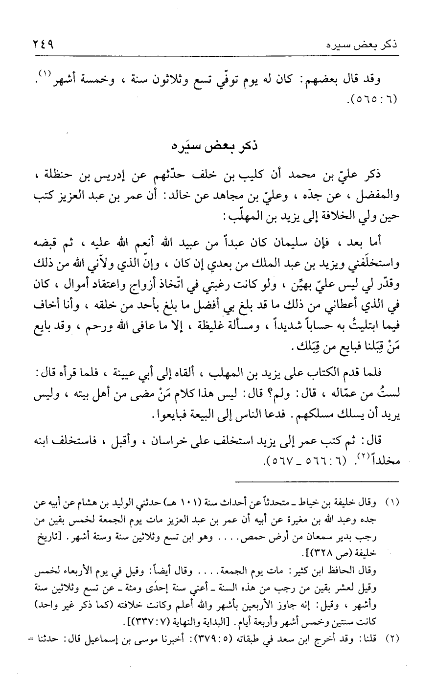(١) وقال خليفة بن خياط - متحدثًا عن أحداث سنة (١٠١ هـ) حدثني الوليد بن هشام عن أبيه عن جده وعبد الله بن مغيرة عن أبيه أن عمر بن عبد العزيز مات يوم الجمعة لخمس بقين من رجب بدير سمعان من أرض حمص ... وهو ابن تسع وثلاثين سنة وستة أشهر. [تاريخ خليفة (ص ٣٢٨)].