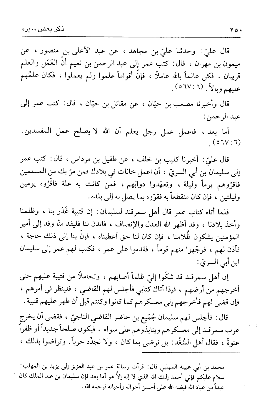 قال عليّ: وحدثنا عليّ بن مجاهد، عن عبد الأعلى بن منصور، عن ميمون بن مهران، قال: كتب عمر إلى عبد الرحمن بن نعيم أنّ العَمَل والعلم قريبان، فكن عالمًا بالله عاملًا، فإنّ أقوامًا علموا ولم يعملوا، فكان علمُهم عليهم وبالًا. (٦: ٥٦٧).