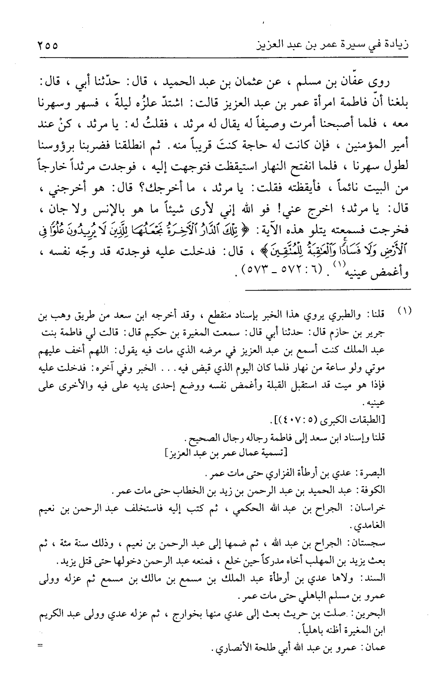 (١) قلنا: والطبري يروي هذا الخبر بإسناد منقطع، وقد أخرجه ابن سعد من طريق وهب بن جرير بن حازم قال: حدثنا أبي قال: سمعت المغيرة بن حكيم قال: قالت لي فاطمة بنت عبد الملك كنت أسمع بن عبد العزيز في مرضه الذي مات فيه يقول: اللهم أخف عليهم موتي ولو ساعة من نهار فلما كان اليوم الذي قبض فيه ... الخبر وفي آخره: فدخلت عليه فإذا هو ميت قد استقبل القبلة وأغمض نفسه ووضع إحدى يديه على فيه والأخرى على عينيه.