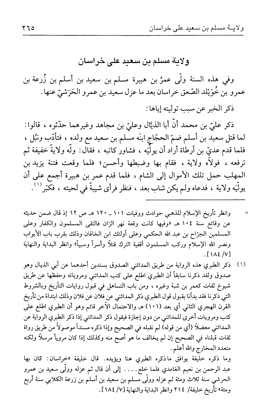 وما ذكره خليفة يوافق ما ذكره الطبري هنا ويؤيده. قال خليفة "خراسان: كان بها عبد الرحمن بن نعيم الغامدي فلما خلع .... إلى أن قال ثم عزله وولّى سعيد بن عمرو الحرشي سنة ثلاث ومئة ثم عزله وولّى مسلم بن سعيد بن أسلم بن زرعة الكلابي سنة أربع ومئة" تأريخ خليفة / ٢١٤ وانظر البداية والنهاية [٧/ ١٨٤].