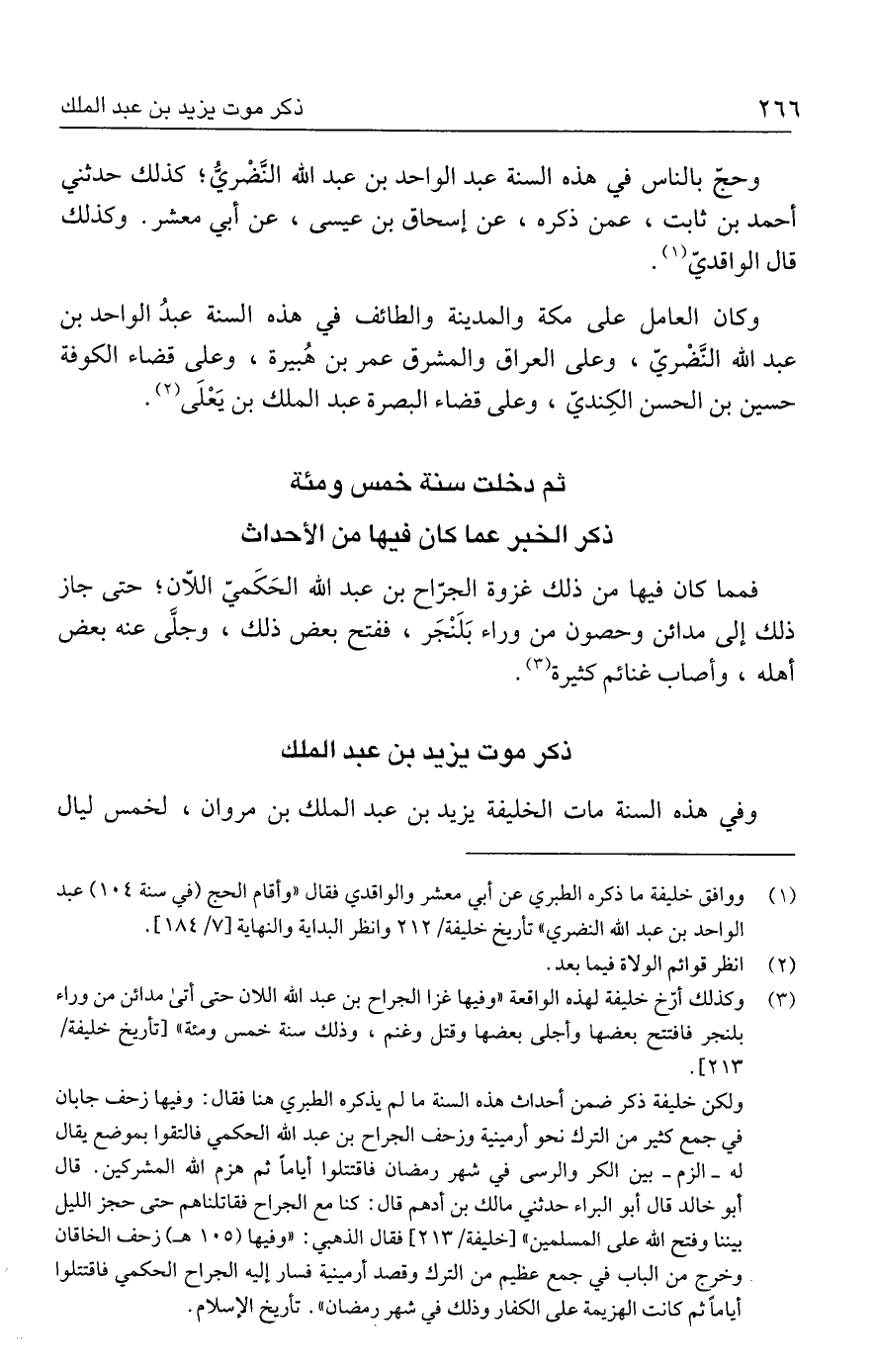 (٣) وكذلك أرّخ خليفة لهذه الواقعة "وفيها غزا الجراح بن عبد الله اللان حتى أتى مدائن من وراء بلنجر فافتتح بعضها وأجلى بعضها وقتل وغنم، وذلك سنة خمس ومئة" [تأريخ خليفة / ٢١٣].