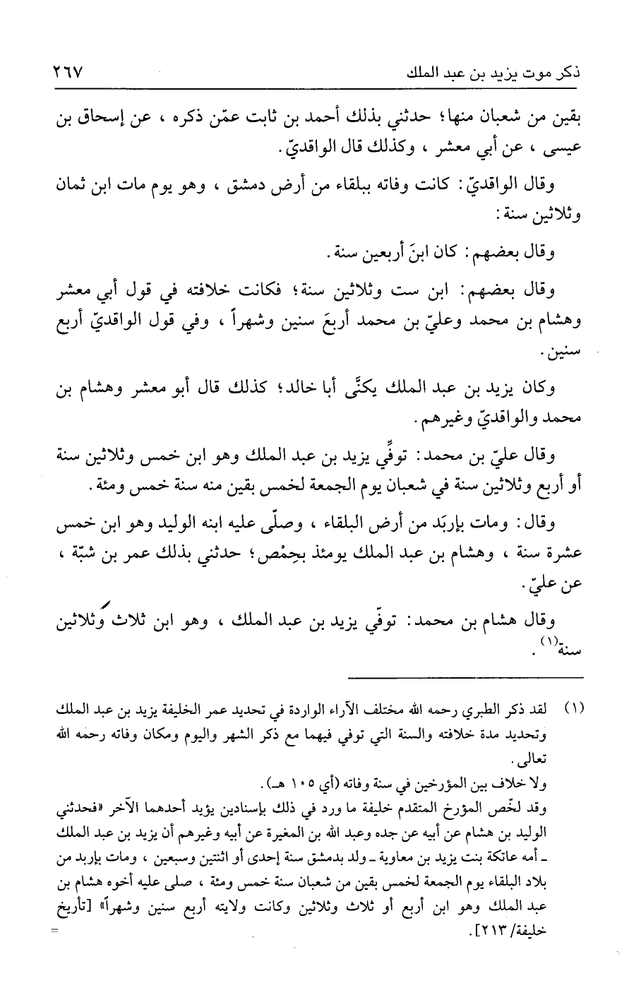 (١) لقد ذكر الطبري رحمه الله مختلف الآراء الواردة في تحديد عمر الخليفة يزيد بن عبد الملك وتحديد مدة خلافته والسنة التي توفي فيهما مع ذكر الشهر واليوم ومكان وفاته رحمه الله تعالى.