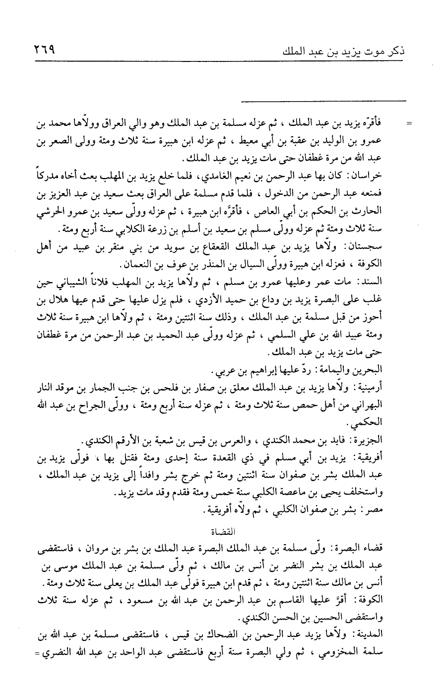 السند: مات عمر وعليها عمرو بن مسلم، ثم ولّاها يزيد بن المهلب فلانًا الشيباني حين غلب على البصرة يزيد بن وداع بن حميد الأزدي، فلم يزل عليها حتى قدم عيها هلال بن أحوز من قبل مسلمة بن عبد الملك، وذلك سنة اثنتين ومئة، ثم ولّاها ابن هبيرة سنة ثلاث ومئة عبيد الله بن علي السلمي، ثم عزله وولّى عبد الحميد بن عبد الرحمن من مرة غطفان حتى مات يزيد بن عبد الملك.
