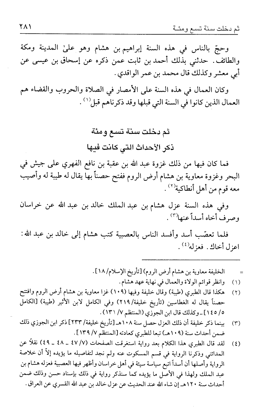 (٣) بينما ذكر خليفة أن ذلك العزل حصل سنة ١٠٨ هـ[تأريخ خليفة / ٢٣٣] ذكر ابن الجوزي ذلك ضمن أحداث سنة (١٠٩ هـ) تبعا للطبري كعادته [المنتظم ٧/ ١٣٩].
