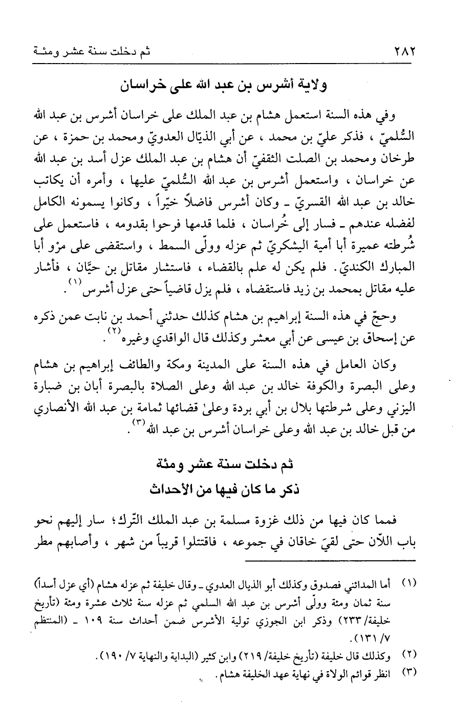 (١) أما المدائني فصدوق وكذلك أبو الذيال العدوي - وقال خليفة ثم عزله هشام (أي عزل أسدًا) سنة ثمان ومئة وولّى أشرس بن عبد الله السلمي ثم عزله سنة ثلاث عشرة ومئة (تأريخ خليفة / ٢٣٣) وذكر ابن الجوزي تولية الأشرس ضمن أحداث سنة ١٠٩ - (المنتظم ٧/ ١٣١).