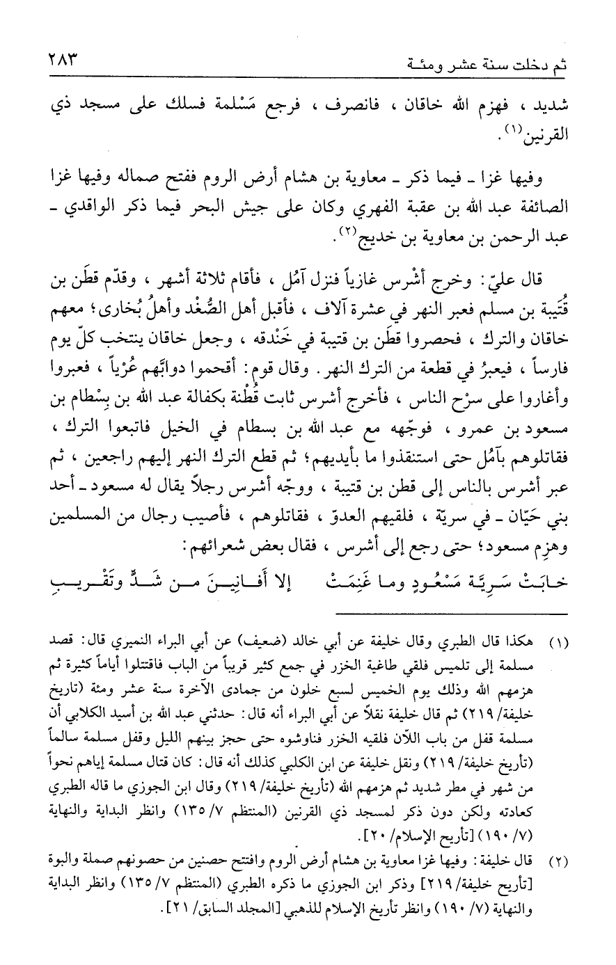 (٢) قال خليفة: وفيها غزا معاوية بن هشام أرض الروم وافتتح حصنين من حصونهم صملة والبوة [تأريح خليفة / ٢١٩] وذكر ابن الجوزي ما ذكره الطبري (المنتظم ٧/ ١٣٥) وانظر البداية والنهاية (٧/ ١٩٠) وانظر تأريخ الإسلام للذهبي [المجلد السابق / ٢١].