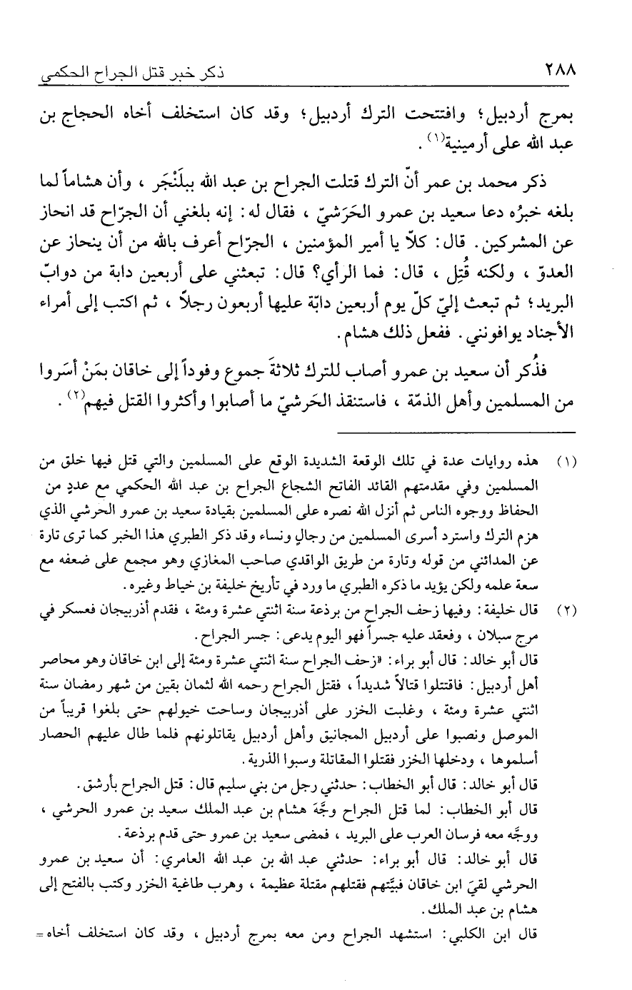 (١) هذه روايات عدة في تلك الوقعة الشديدة الوقع على المسلمين والتي قتل فيها خلق من المسلمين وفي مقدمتهم القائد الفاتح الشجاع الجراح بن عبد الله الحكمي مع عددٍ من الحفاظ ووجوه الناس ثم أنزل الله نصره على المسلمين بقيادة سعيد بن عمرو الحرشي الذي هزم الترك واسترد أسرى المسلمين من رجالٍ ونساء وقد ذكر الطبري هذا الخبر كما ترى تارة عن المدائني من قوله وتارة من طريق الواقدي صاحب المغازي وهو مجمع على ضعفه مع سعة علمه ولكن يؤيد ما ذكره الطبري ما ورد في تأريخ خليفة بن خياط وغيره.
