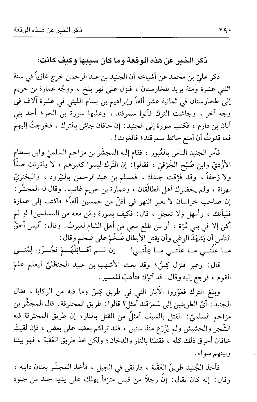 فأمر الجنيد الناس بالعُبور، فقام إليه المجشّر بن مزاحم السلميّ وابن بسطام الأزْديّ وابن صُبْح الخَرَقيّ، فقالوا: إن التُرك ليسوا كغيرهم، لا يلقونك صفًّا ولا زحفًا، وقد فرَّقت جندك، فمسلم بن عبد الرحمن بالنيروذ، والبختريّ بهراة، ولم يحضرك أهل الطالقان، وعمارة بن حريم غائب. وقال له المجشِّر: إن صاحب خراسان لا يعبر النهر في أقلّ من خمسين ألفًا؛ فاكتب إلى عمارة فليأتك، وأمهل ولا تعجل، قال: فكيف بسورة ومَن معه من المسلمين! لو لم أكن إلا في بني مُرّة، أو من طلع معي من أهل الشأم لعبرتُ. وقال: أليس أحقَّ الناسِ أن يَشهَدَ الوغى وأن يقتل الأبطال ضَخْمٌ على ضخم وقال: