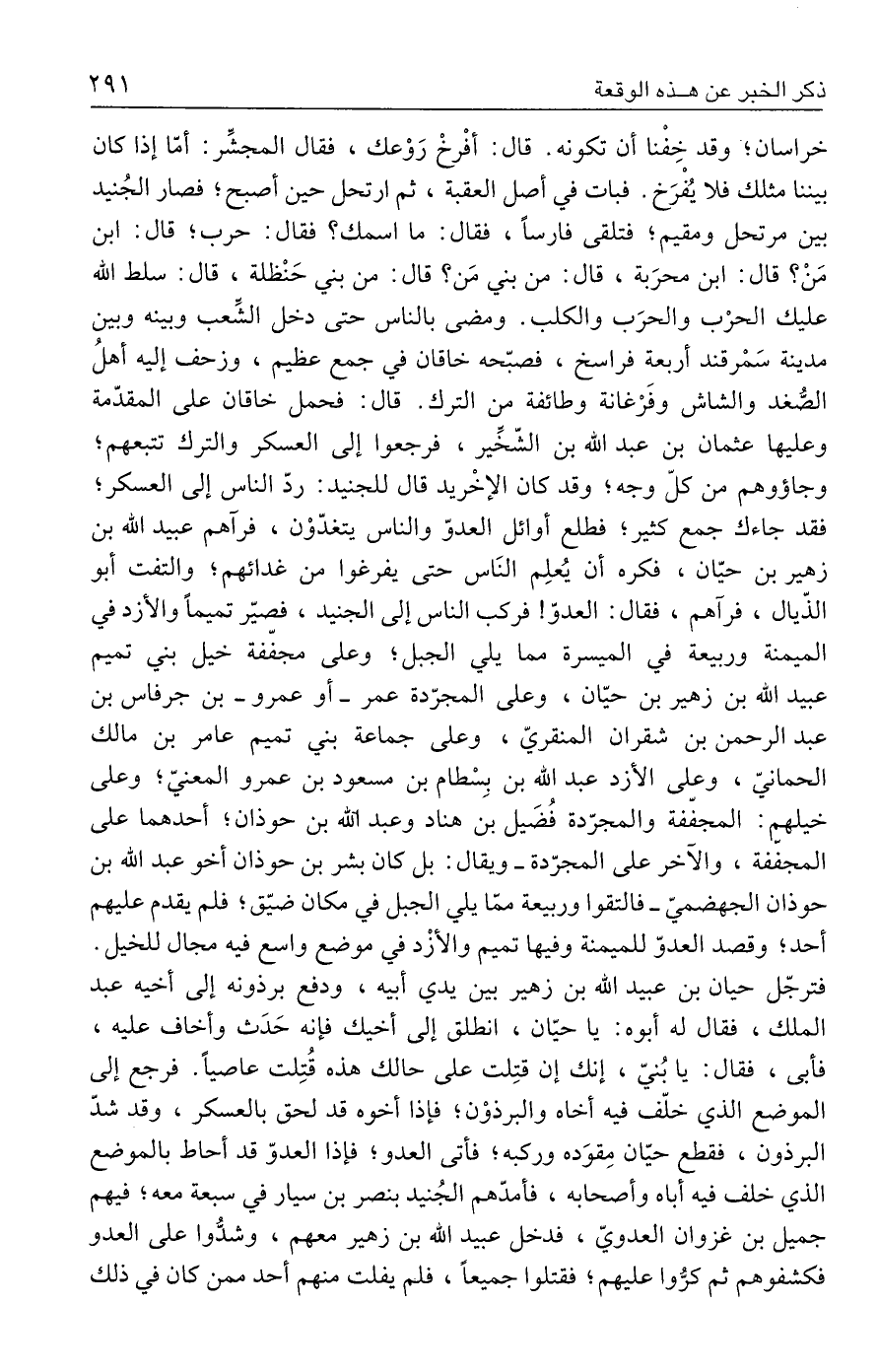 خراسان؛ وقد خِفْنا أن تكونه. قال: أفْرخْ رَوْعك، فقال المجشِّر: أمّا إذا كان بيننا مثلك فلا يُفْرَخ. فبات في أصل العقبة، ثم ارتحل حين أصبح؛ فصار الجُنيد بين مرتحل ومقيم؛ فتلقى فارسًا، فقال: ما اسمك؟ فقال: حرب؟ قال: ابن مَنْ؟ قال: ابن محرَبة، قال: من بني مَن؟ قال: من بني حَنْظلة، قال: سلط الله عليك الحرْب والحرَب والكلب. ومضى بالناس حتى دخل الشِّعب وبينه وبين مدينة سَمْرقند أربعة فراسخ، فصبّحه خاقان في جمع عظيم، وزحف إليه أهلُ الصُّغد والشاش وفَرْغانة وطائفة من الترك. قال: فحمل خاقان على المقدّمة وعليها عثمان بن عبد الله بن الشّخِّير، فرجعوا إلى العسكر والترك تتبعهم؛ وجاؤوهم من كلّ وجه؛ وقد كان الإخْريد قال للجنيد: ردّ الناس إلى العسكر؛ فقد جاءك جمع كثير؛ فطلع أوائل العدوّ والناس يتغدّوْن، فرآهم عبيد الله بن زهير بن حيّان، فكره أن يُعلِم النَّاس حتى يفرغوا من غدائهم؛ والتفت أبو الذّيال، فرآهم، فقال: العدوّ! فركب الناس إلى الجنيد، فصيّر تميمًا والأزد في الميمنة وربيعة في الميسرة مما يلي الجبل؛ وعلى مجفّفة خيل بني تميم عبيد الله بن زهير بن حيّان، وعلى المجرّدة عمر -أو عمرو- بن جرفاس بن عبد الرحمن بن شقران المنقريّ، وعلى جماعة بني تميم عامر بن مالك الحمانيّ، وعلى الأزد عبد الله بن بِسْطام بن مسعود بن عمرو المعنيّ؛ وعلى خيلهيم: المجفّفة والمجرّدة فُضَيل بن هناد وعبد الله بن حوذان؛ أحدهما على المجففة، والآخر على المجرّدة - ويقال: بل كان بشر بن حوذان أخو عبد الله بن حوذان الجهضميّ - فالتقوا وربيعة ممّا يلي الجبل في مكان ضيّق؛ فلم يقدم عليهم أحد؛ وقصد العدوّ للميمنة وفيها تميم والأزْد في موضع واسع فيه مجال للخيل. فترجّل حيان بن عبيد الله بن زهير بين يدي أبيه، ودفع برذونه إلى أخيه عبد الملك، فقال له أبوه: يا حيّان، انطلق إلى أخيك فإنه حَدَث وأخاف عليه، فأبى، فقال: يا بُنيّ، إنك إن قتِلت على حالك هذه قُتِلت عاصيًا. فرجع إلى الموضع الذي خلّف فيه أخاه والبرذوْن؛ فإذا أخوه قد لحق بالعسكر، وقد شدّ البرذون، فقطع حيّان مِقوَده وركبه؛ فأتى العدو؛ فإذا العدوّ قد أحاط بالموضع الذي خلف فيه أباه وأصحابه، فأمدّهم الجُنيد بنصر بن سيار في سبعة معه؛ فيهم جميل بن غزوان العدويّ، فدخل عبيد الله بن زهير معهم، وشدُّوا على العدو فكشفوهم ثم كرُّوا عليهم؛ فقتلوا جميعًا، فلم يفلت منهم أحد ممن كان في ذلك