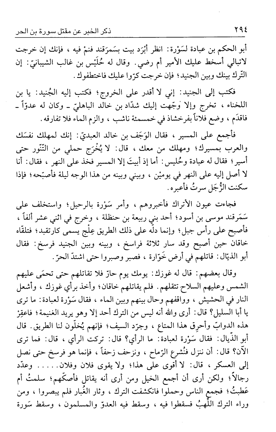 وقال بعضهم: قال له غوزك: يومك يوم حارّ فلا تقاتلهم حتى تحمَى عليهم الشمس وعليهم السلاح. تثقلهم. فلم يقاتلهم خاقان؛ وأخذ برأي غوزك، وأشعل النار في الحشيش، وواقفهم وحال بينهم وبين الماء، فقال سَوْرة لعبادة: ما ترى يا أبا السليل؟ قال: أرى والله أنه ليس من الترك أحد إلا وهو يريد الغنيمة؛ فاعقِرْ هذه الدوابّ وأحرِق هذا المتاع، وجرّد السيف؛ فإنهم يُخلّون لنا الطريق. قال أبو الذّيال: فقال سَوْرة لعبادة: ما الرأي؟ قال: تركت الرأي، قال: فما ترى الآن؟ قال: أن ننزل فنُشرع الرّماح، ونزحف زحفًا، فإنما هو فرسخ حتى نصل إلى العسكر، قال: لا أقوى على هذا؛ ولا يقوى فلان وفلان. . وعدّد رجالًا؛ ولكن أرى أن أجمع الخيل ومن أرى أنه يقاتل فأصكّهم؛ سلمتُ أم عَطبتُ؛ فجمع الناس وحملوا فانكشفت الترك، وثار الغُبار فلم يبصروا، ومن وراء الترك اللِّهبُ فسقطوا فيه، وسقط فيه العدوّ والمسلمون، وسقط سَورة