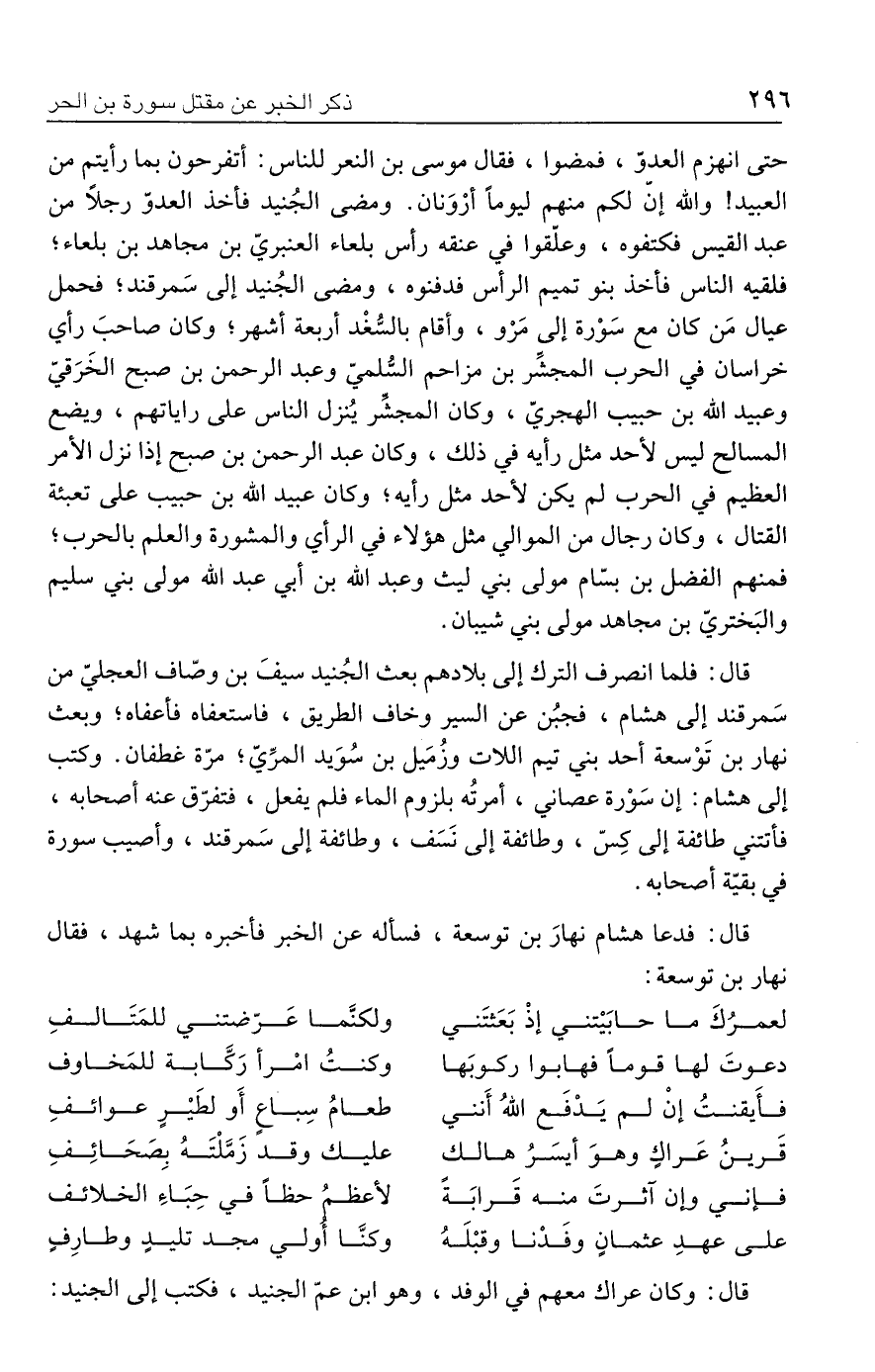 حتى انهزم العدوّ، فمضوا، فقال موسى بن النعر للناس: أتفرحون بما رأيتم من العبيد! والله إن لكم منهم ليومًا أرْوَنان. ومضى الجُنيد فأخذ العدوّ رجلًا من عبد القيس فكتفوه، وعلّقوا في عنقه رأس بلعاء العنبريّ بن مجاهد بن بلعاء؛ فلقيه الناس فأخذ بنو تميم الرأس فدفنوه، ومضى الجُنيد إلى سَمرقند؛ فحمل عيال مَن كان مع سَوْرة إلى مَرْو، وأقام بالسُّغْد أربعة أشهر؛ وكان صاحبَ رأي خراسان في الحرب المجشِّر بن مزاحم السُّلميّ وعبد الرحمن بن صبح الخَرَقيّ وعبيد الله بن حبيب الهجريّ، وكان المجشِّر يُنزل الناس على راياتهم، ويضع المسالح ليس لأحد مثل رأيه في ذلك، وكان عبد الرحمن بن صبح إذا نزل الأمر العظيم في الحرب لم يكن لأحد مثل رأيه؛ وكان عبيد الله بن حبيب على تعبئة القتال، وكان رجال من الموالي مثل هؤلاء في الرأي والمشورة والعلم بالحرب؛ فمنهم الفضل بن بسّام مولى بني ليث وعبد الله بن أبي عبد الله مولى بني سليم والبَختريّ بن مجاهد مولى بني شيبان.