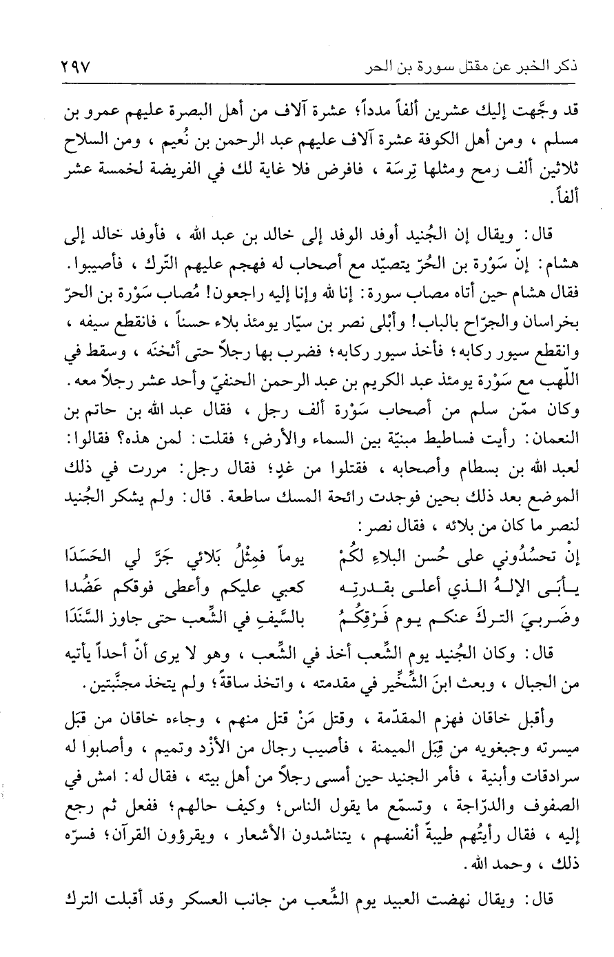 قال: ويقال إن الجُنيد أوفد الوفد إلى خالد بن عبد الله، فأوفد خالد إلى هشام: إنّ سَوْرة بن الحُرّ يتصيّد مع أصحاب له فهجم عليهم التّرك، فأصيبوا. فقال هشام حين أتاه مصاب سورة: إنا لله وإنا إليه راجعون! مُصاب سَوْرة بن الحرّ بخراسان والجرّاح بالباب! وأبْلى نصر بن سيّار يومئذ بلاء حسنًا، فانقطع سيفه، وانقطع سيور ركابه؛ فأخذ سيور ركابه؛ فضرب بها رجلًا حتى أثخنَه، وسقط في اللهب مع سَوْرة يومئذ عبد الكريم بن عبد الرحمن الحنفيّ وأحد عشر رجلًا معه. وكان ممّن سلم من أصحاب سَوْرة ألف رجل، فقال عبد الله بن حاتم بن النعمان: رأيت فساطيط مبنيّة بين السماء والأرض؛ فقلت: لمن هذه؟ فقالوا: لعبد الله بن بسطام وأصحابه، فقتلوا من غدٍ؛ فقال رجل: مررت في ذلك الموضع بعد ذلك بحين فوجدت رائحة المسك ساطعة. قال: ولم يشكر الجُنيد لنصر ما كان من بلائه، فقال نصر: