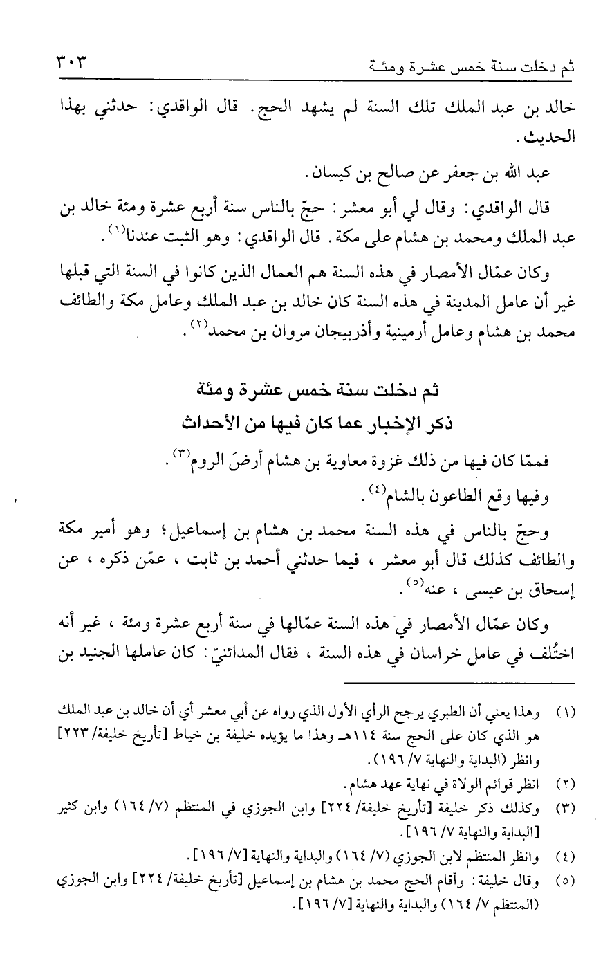 (١) وهذا يعني أن الطبري يرجح الرأي الأول الذي رواه عن أبي معشر أي أن خالد بن عبد الملك هو الذي كان على الحج سنة ١١٤ هـ وهذا ما يؤيده خليفة بن خياط [تأريخ خليفة / ٢٢٣] وانظر (البداية والنهاية ٧/ ١٩٦).