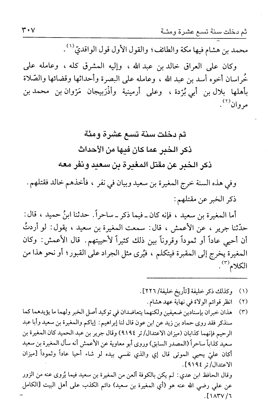 (٣) هذان خبران بإسنادين ضعيفين ولكنهما يتعاضدان في توكيد أصل الخبر ولهما ما يؤيدهما كما سنذكر فقد روى حماد بن زيد عن ابن عون قال لنا إبراهيم: إياكم والمغيرة بن سعيد وأبا عبد الرحيم فإنهما كذابان (ميزان الاعتدال / تر ٩١٩٤) وقال جرير بن عبد الحميد كان المغيرة بن سعيد كذابًا ساحرًا (المصدر السابق) وروى أبو معاوية عن الأعمش أنه سأل المغيرة بن سعيد أكان عليّ يحيي الموتى قال إي والذي نفسي بيده لو شاء أحيا عادًا وثمودًا [ميزان الاعتدال / تر ٩١٩٤].