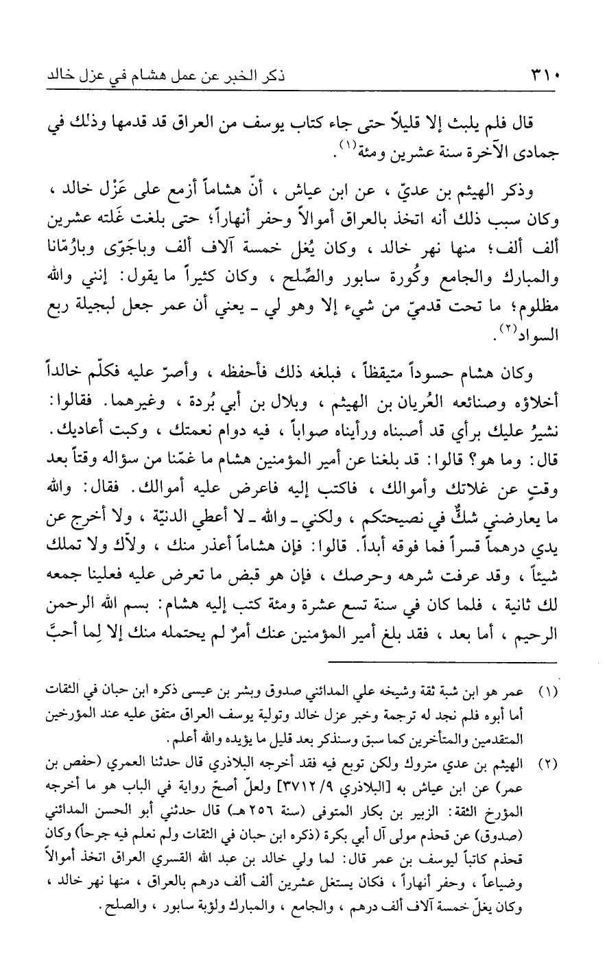 (١) عمر هو ابن شبة ثقة وشيخه علي المدائني صدوق وبشر بن عيسى ذكره ابن حبان في الثقات أما أبوه فلم نجد له ترجمة وخبر عزل خالد وتولية يوسف العراق متفق عليه عند المؤرخين المتقدمين والمتأخرين كما سبق وسنذكر بعد قليل ما يؤيده والله أعلم.