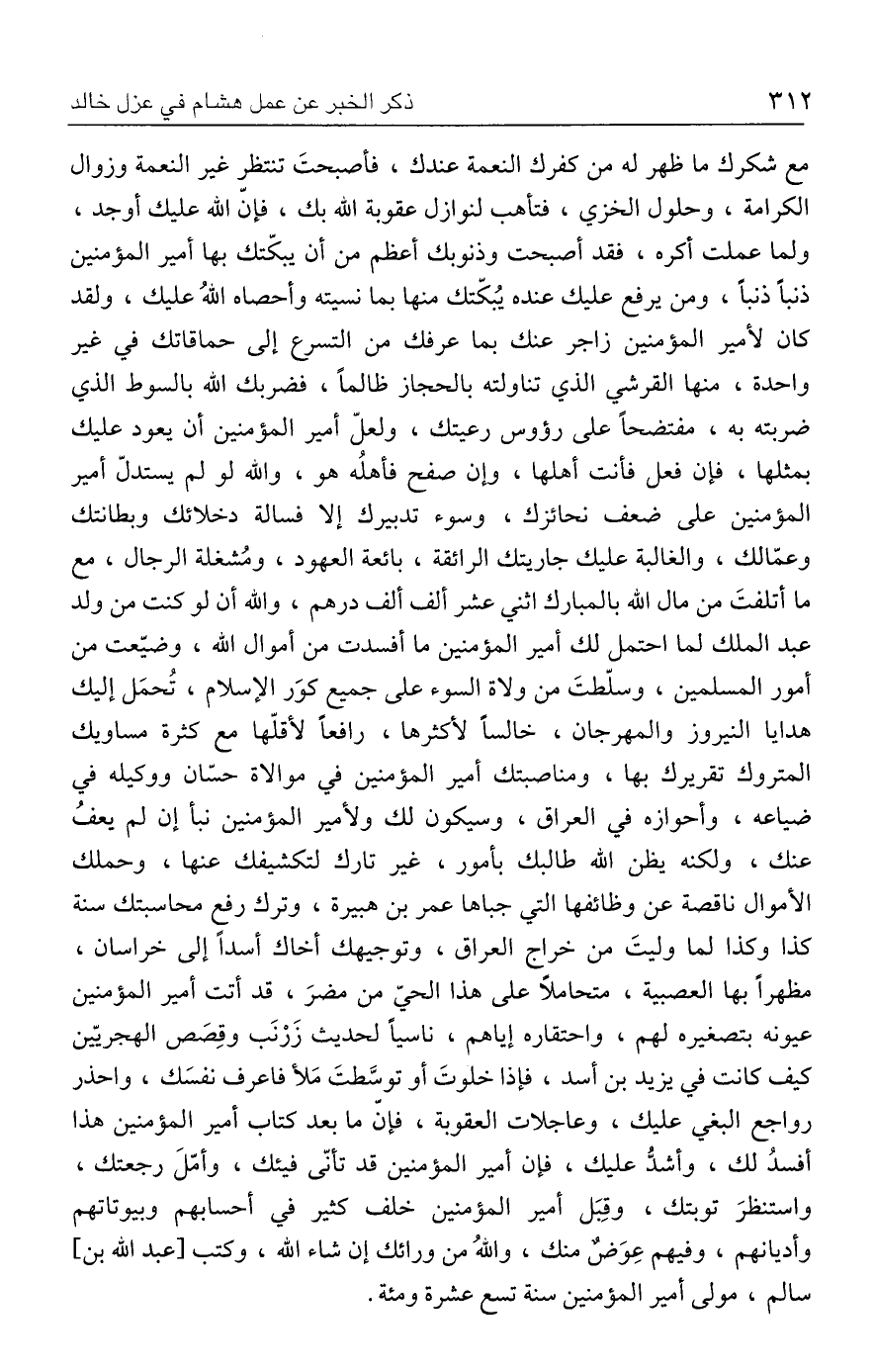 مع شكرك ما ظهر له من كفرك النعمة عندك، فأصبحتَ تنتظر غير النعمة وزوال الكرامة، وحلول الخزي، فتأهب لنوازل عقوبة الله بك، فإن الله عليك أوجد، ولما عملت أكره، فقد أصبحت وذنوبك أعظم من أن يبكّتك بها أمير المؤمنين ذنبًا ذنبًا، ومن يرفع عليك عنده يُبكّتك منها بما نسيته وأحصاه اللهُ عليك، ولقد كان لأمير المؤمنين زاجر عنك بما عرفك من التسرع إلى حماقاتك في غير واحدة، منها القرشي الذي تناولته بالحجاز ظالمًا، فضربك الله بالسوط الذي ضربته به، مفتضحًا على رؤوس رعيتك، ولعلّ أمير المؤمنين أن يعود عليك بمثلها، فإن فعل فأنت أهلها، وإن صفح فأهلُه هو، والله لو لم يستدلّ أمير المؤمنين على ضعف نحائزك، وسوء تدبيرك إلا فسالة دخلائك وبطانتك وعمّالك، والغالبة عليك جاريتك الرائقة، بائعة العهود، ومُشغلة الرجال، مع ما أتلفتَ من مال الله بالمبارك اثني عشر ألف ألف درهم، والله أن لو كنت من ولد عبد الملك لما احتمل لك أمير المؤمنين ما أفسدت من أموال الله، وضيّعت من أمور المسلمين، وسلّطتَ من ولاة السوء على جميع كوَر الإسلام، تُحمَل إليك هدايا النيروز والمهرجان، خالسًا لأكثرها، رافعًا لأقلّها مع كثرة مساويك المتروك تقريرك بها، ومناصبتك أمير المؤمنين في موالاة حسّان ووكيله في ضياعه، وأحوازه في العراق، وسيكون لك ولأمير المؤمنين نبأ إن لم يعفُ عنك، ولكنه يظن الله طالبك بأمور، غير تارك لتكشيفك عنها، وحملك الأموال ناقصة عن وظائفها التي جباها عمر بن هبيرة، وترك رفع محاسبتك سنة كذا وكذا لما وليتَ من خراج العراق، وتوجيهك أخاك أسدًا إلى خراسان، مظهرًا بها العصبية، متحاملًا على هذا الحيّ من مضرَ، قد أتت أمير المؤمنين عيونه بتصغيره لهم، واحتقاره إياهم، ناسيًا لحديث زَرْنَب وقِصص الهجريّين كيف كانت في يزيد بن أسد، فإذا خلوتَ أو توسَّطتَ مَلأ فاعرف نفسَك، واحذر رواجع البغي عليك، وعاجلات العقوبة، فإنّ ما بعد كتاب أمير المؤمنين هذا أفسدُ لك، وأشدُّ عليك، فإن أمير المؤمنين قد تأنّى فيئك، وأمّلَ رجعتك، واستنظرَ توبتك، وقِبَل أمير المؤمنين خلف كثير في أحسابهم وبيوتاتهم وأديانهم، وفيهم عِوَضٌ منك، واللهُ من ورائك إن شاء الله، وكتب [عبد الله بن] سالم، مولى أمير المؤمنين سنة تسع عشرة ومئة.