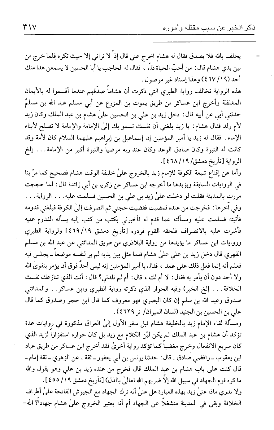 وأما عن إقناع شيعة الكوفة للإمام زيد بالخروج على خليفة الوقت هشام فصحيح كما مرّ بنا في الروايات السابقة ويؤيدها ما أخرجه ابن عساكر عن زكريا بن أبي زائدة قال: لما حججت مررت بالمدينة فقلت لو دخلت على زيد بن علي بن الحسين فسلمت عليه ... الرواية ... وفي آخرها: فخرجت من عنده فمضيت فقضيت حجتي ثم انصرفت إلى الكوفة فبلغني قدومه فأتيته فسلمت عليه ومسألته عما قدم له فأخبرني بكتب من كتب إليه يسأله القدوم عليه فأشرت عليه بالانصراف فلحقه القوم فردوه [تأريخ دمشق ١٩/ ٤٦٩] ولرواية الطبري وروايات ابن عساكر ما يؤيدها من رواية البلاذري من طريق المدائني عن عبد الله بن مسلم الفهري قال دخل زيد بن علي على هشام فلما مثل بين يديه لم ير لنفسه موضعًا - يجلس فيه فعلم أنه إنما فعل ذلك على عمد، فقال يا أمير المؤمنين إنه ليس أحدٌ فوق أن يؤمر بتقوى الله ولا أحد دون أن يأمر به فقال: لا أم لك، قال: أم لم تلدني؟ قال: أنت الذي تنازعك نفسك الخلافة ... إلخ الخبر) وفيه الحوار الذي ذكرته رواية الطبري وابن عساكر .. والمدائني صدوق وعبد الله بن سلم إن كان البصري فهو معروف كما قال ابن حجر وصدوق كما قال علي بن الحسين بن الجنيد (لسان الميزان / تر ٤٦٢٩).