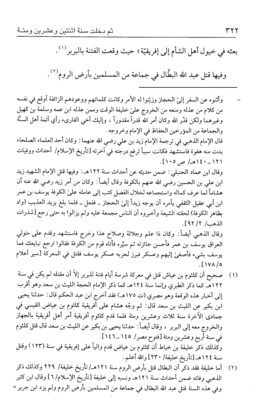 (٢) أما خليفة فقد ذكر أن البطال قتل بأرض الروم سنة ١٢١ هـ / تأريخ خليفة / ٢٢٩ وكذلك ذكر الذهبي وفاته ضمن أحداث سنة ١٢١ هـ ونسبه إلى خليفة [تأريخ الإسلام / ٦] وقال ابن كثير وفي هذه السنة قتل عبد الله البطال في جماعة من المسلمين بأرض الروم ولم يزد ابن جرير =