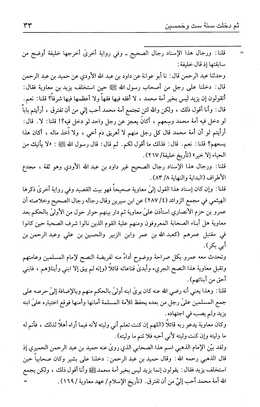 وحدثنا عبد الرحمن قال: نا أبو عوانة عن داود بن عبد الله الأودي عن حميد بن عبد الرحمن قال: دخلنا على رجل من أصحاب رسول الله - صلى الله عليه وسلم - حين استخلف يزيد بن معاوية فقال: أتقولون إن يزيد ليس بخير أمة محمد، لا أفقه فيها فقهًا ولا أعظمها فيها شرفًا؟ قلنا: نعم. قال: وأنا أقول ذلك، ولكن والله لئن تجتمع أمة محمد أحب إلي من أن تفترق، أرأيتم بابًا لو دخل فيه أمة محمد وسِعهم، أكانَ يعجز عن رجل واحد لو دخل فيه؟ ! قلنا: لا. قال: أرأيتم لو أن أمة محمد قال كل رجل منهم لا أهريق دم أخي، ولا آخذ ماله، أكان هذا يسعهم؟ قلنا: نعم. قال: فذلك ما أقول لكم. ثم قال: قال رسول الله - صلى الله عليه وسلم -: "لا يأتيك من الحياء إلا خير" (تأريخ خليفة / ٢١٧).