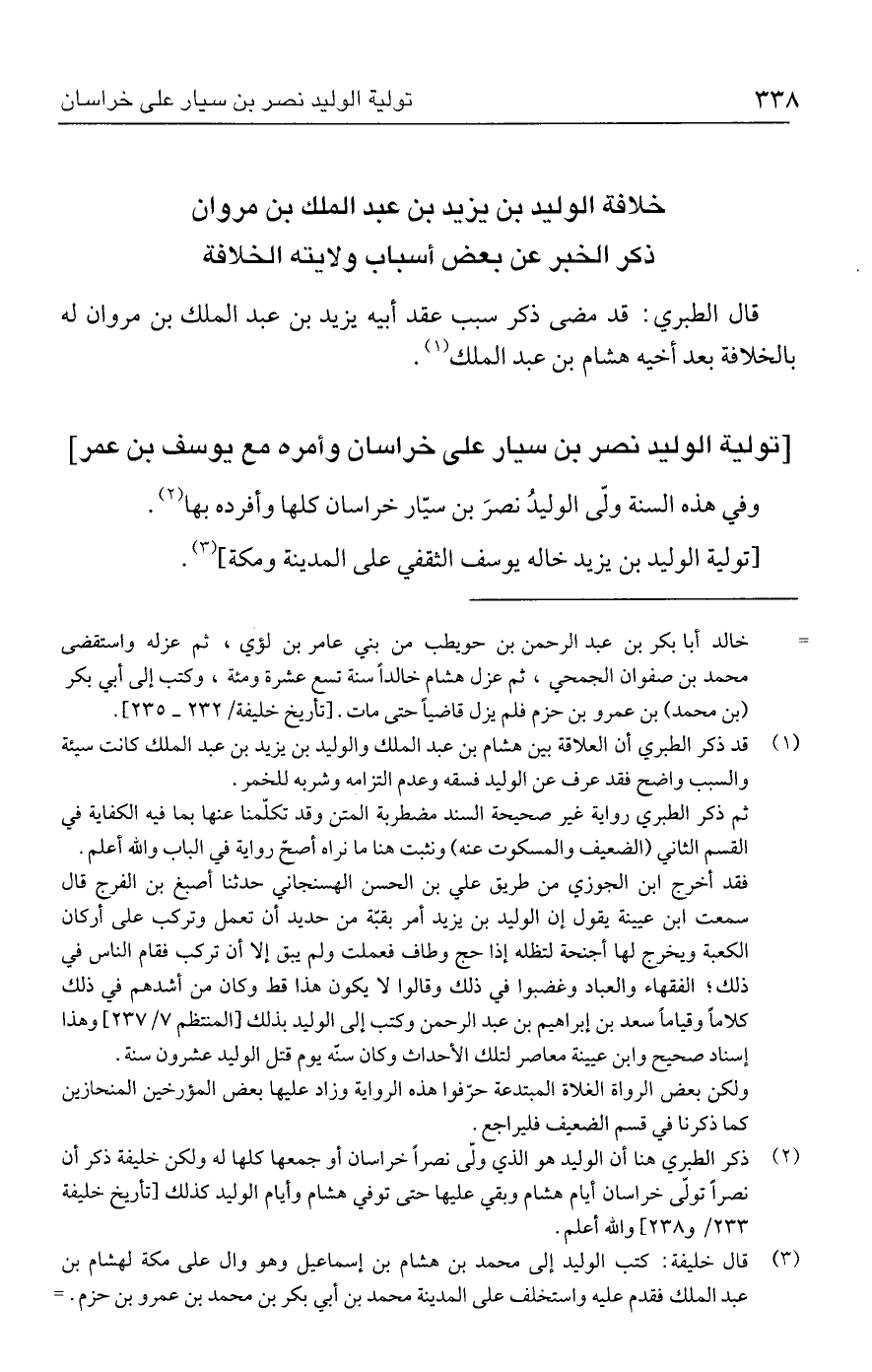 (٢) ذكر الطبري هنا أن الوليد هو الذي ولّى نصرًا خراسان أو جمعها كلها له ولكن خليفة ذكر أن نصرا تولّى خراسان أيام هشام وبقي عليها حتى توفي هشام وأيام الوليد كذلك [تأريخ خليفة ٢٣٣ / و ٢٣٨] والله أعلم.
