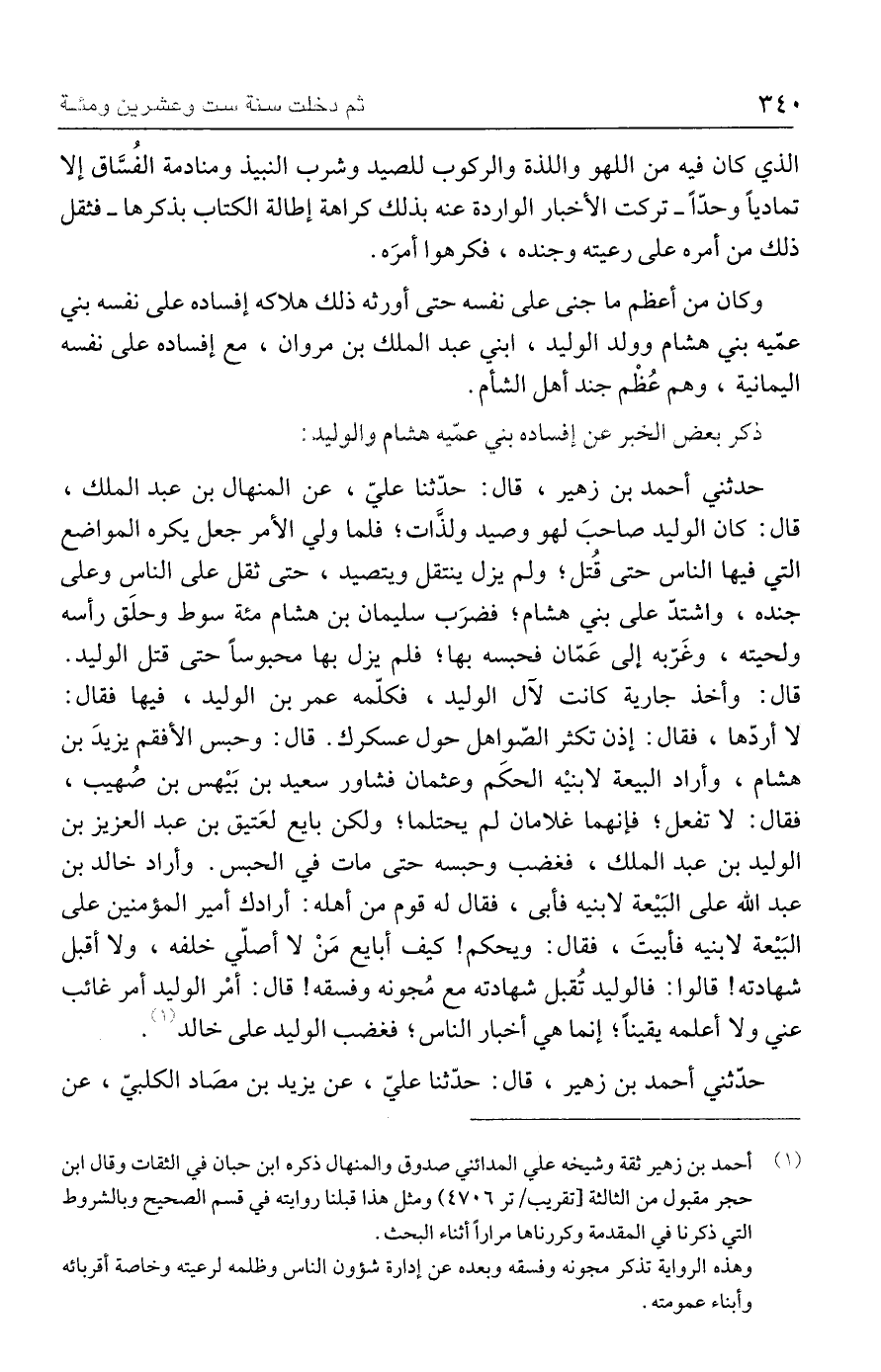 حدثني أحمد بن زهير، قال: حدَّثنا عليّ، عن المنهال بن عبد الملك، قال: كان الوليد صاحبَ لهو وصيد ولذات؛ فلما ولي الأمر جعل يكره المواضع التي فيها الناس حتى قُتل؛ ولم يزل ينتقل ويتصيد، حتى ثقل على الناس وعلى جنده، واشتدّ علي بني هشام؛ فضرَب سليمان بن هشام مئة سوط وحلَق رأسه ولحيته، وغَرّبه إلى عَمّان فحبسه بها؛ فلم يزل بها محبوسًا حتى قتل الوليد.