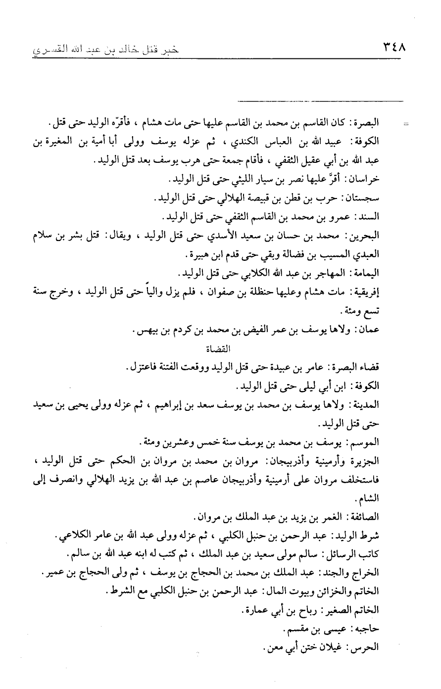= البصرة: كان القاسم بن محمد بن القاسم عليها حتى مات هشام، فأقرّه الوليد حتى قتل.