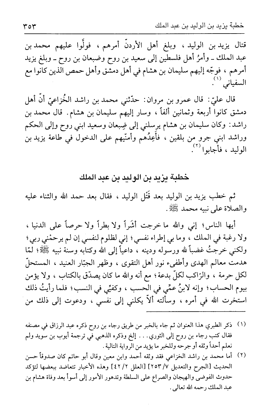 (٢) أما محمد بن راشد الخزاعي فقد وثقه أحمد وابن معين وقال أبو حاتم كان صدوقًا حسن الحديث [الجرح والتعديل ٧/ ٢٥٣] [العلل ٢/ ٤٢] وهذه الأخبار تتعاضد ببعضها لتؤكد حدوث الفوضى والهيجان والصراع عبى السلطة وتدهور الأمور إلى أسوأ بعد وفاة هشام بن عبد الملك رحمه الله تعالى.