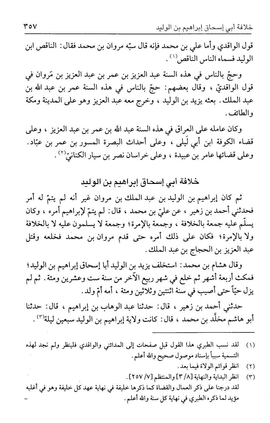 ثم كان إبراهيم بن الوليد بن عبد الملك بن مروان غير أنه لم يتتم له أمر فحدثني أحمد بن زهير، عن عليّ بن محمد، قال: لم يتمّ لإبراهيم أمره، وكان يسلّم عليه جمعة بالخلافة، وجمعة بالإمرة؛ وجمعة لا يسلمون عليه لا بالخلافة ولا بالإمرة؛ فكان على ذلك أمره حتى قدم مروان بن محمد فخلعه وقتل عبد العزيز بن الحجاج بن عبد الملك.