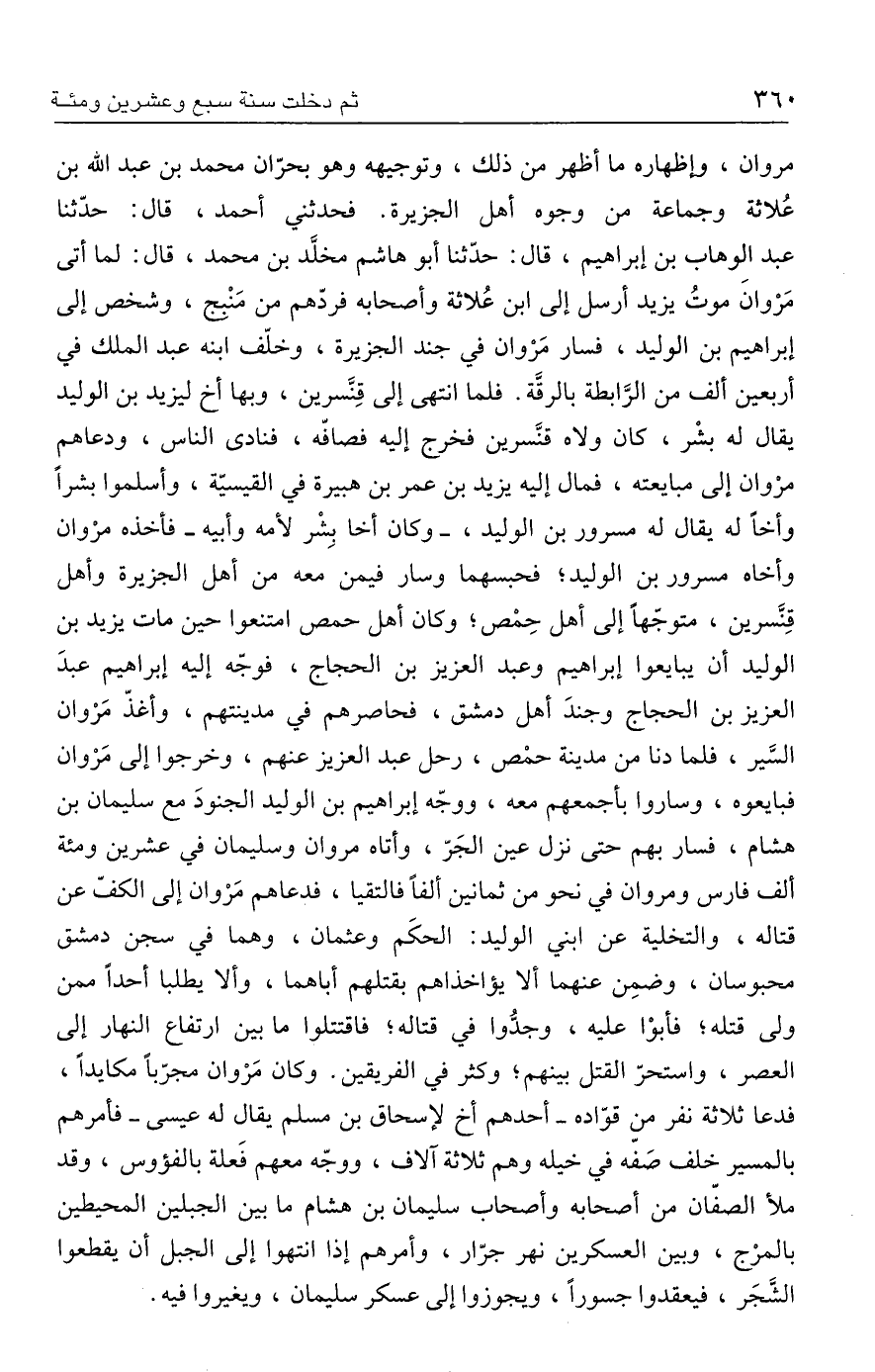 مروان، وإظهاره ما أظهر من ذلك، وتوجيهه وهو بحرّان محمد بن عبد الله بن عُلاثة وجماعة من وجوه أهل الجزيرة. فحدثني أحمد، قال: حدَّثنا عبد الوهاب بن إبراهيم، قال: حدَّثنا أبو هاشم مخلَّد بن محمد، قال: لما أتى مَرْوانَ موتُ يزيد أرسل إلى ابن عُلاثة وأصحابه فردّهم من مَنْبج، وشخص إلى إبراهيم بن الوليد، فسار مَرْوان في جند الجزيرة، وخلّف ابنه عبد الملك في أربعين ألف من الرَّابطة بالرقة. فلما انتهى إلى قِنَّسرين، وبها أخ ليزيد بن الوليد يقال له بشْر، كان ولاه قنَّسرين فخرج إليه فصافّه، فنادى الناس، ودعاهم مرْوان إلى مبايعته، فمال إليه يزيد بن عمر بن هبيرة في القيسيّة، وأسلموا بشرًا وأخًا له يقال له مسرور بن الوليد، - وكان أخا بشر لأمه وأبيه - فأخذه مرْوان وأخاه مسرور بن الوليد؛ فحبسهما وسار فيمن معه من أهل الجزيرة وأهل قِتسرين، متوجّهًا إلى أهل حِمْص؛ وكان أهل حمص امتنعوا حين مات يزيد بن الوليد أن يبايعوا إبراهيم وعبد العزيز بن الحجاج، فوجّه إليه إبراهيم عبدَ العزيز بن الحجاج وجندَ أهل دمشق، فحاصرهم في مدينتهم، وأغذّ مَرْوان السَّير، فلما دنا من مدينة حمْص، رحل عبد العزيز عنهم، وخرجوا إلى مَرْوان فبايعوه، وساروا بأجمعهم معه، ووجّه إبراهيم بن الوليد الجنودَ مع سليمان بن هشام، فسار بهم حتى نزل عين الجَرّ، وأتاه مروان وسليمان في عشرين ومئة ألف فارس ومروان في نحو من ثمانين ألفًا فالتقيا، فدعاهم مَرْوان إلى الكفّ عن قتاله، والتخلية عن ابني الوليد: الحكَم وعثمان، وهما في سجن دمشق محبوسان، وضمِن عنهما ألا يؤاخذاهم بقتلهم أباهما، وألا يطلبا أحدًا ممن ولى قتله؛ فأبوْا عليه، وجدُّوا في قتاله؛ فاقتتلوا ما بين ارتفاع النهار إلى العصر، واستحرّ القتل بينهم؛ وكثر في الفريقين. وكان مَرْوان مجرّبًا مكايدًا، فدعا ثلاثة نفر من قوّاده - أحدهم أخ لإسحاق بن مسلم يقال له عيسى - فأمرهم بالمسير خلف صَفّه في خيله وهم ثلاثة آلاف، ووجّه معهم فَعلة بالفؤوس، وقد ملأ الصفّان من أصحابه وأصحاب سليمان بن هشام ما بين الجبلين المحيطين بالمرْج، وبين العسكرين نهر جرّار، وأمرهم إذا انتهوا إلى الجبل أن يقطعوا الشَّجَر، فيعقدوا جسورًا، ويجوزوا إلى عسكر سليمان، ويغيروا فيه.