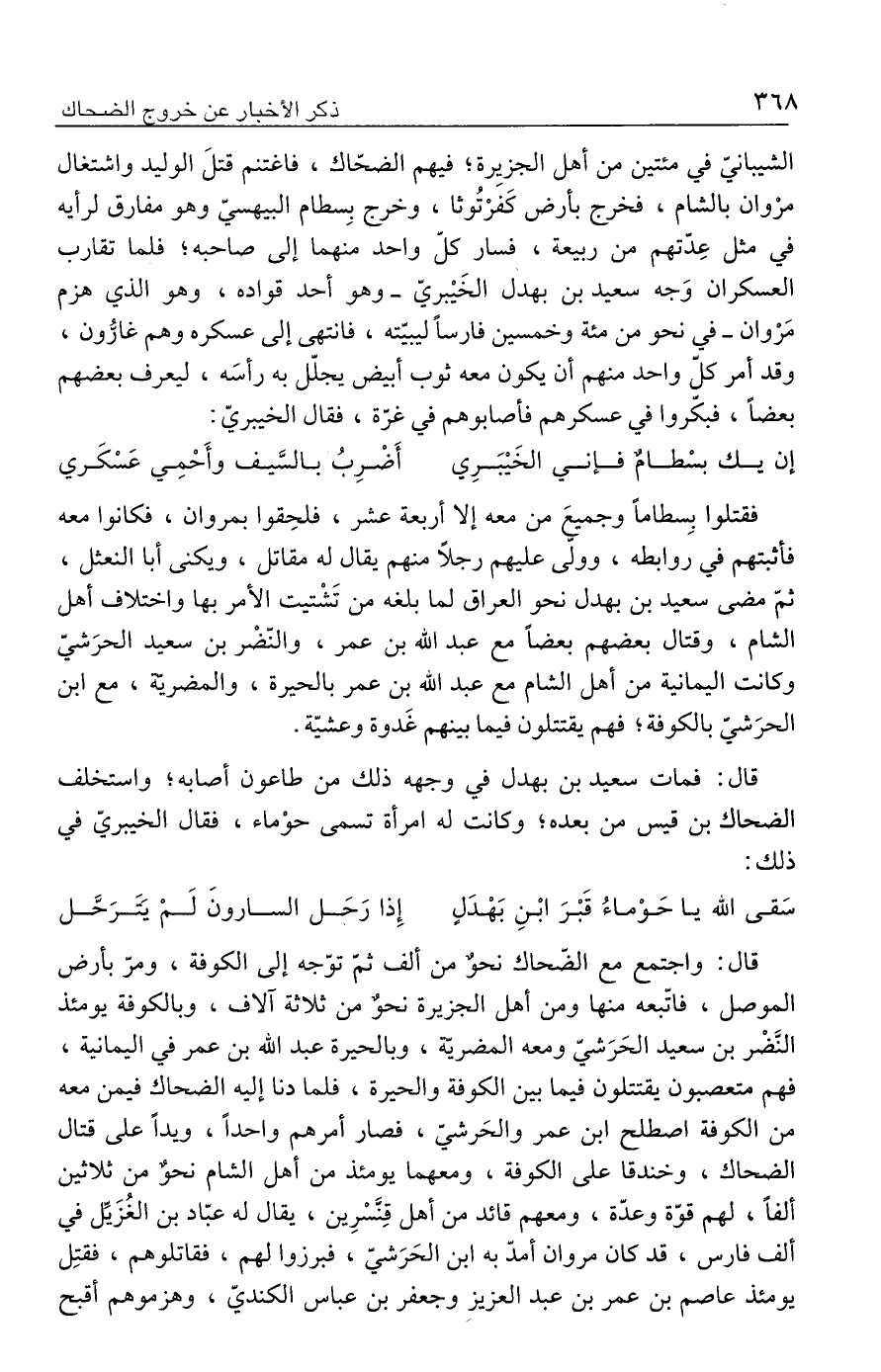 قال: واجتمع مع الضَّحاك نحوٌ من ألف ثمّ توّجه إلى الكوفة، ومرّ بأرض الموصل، فاتّبعه منها ومن أهل الجزيرة نحو من ثلاثة آلاف، وبالكوفة يومئذ النَّضْر بن سعيد الحَرَشيّ ومعه المضريّة، وبالحيرة عبد الله بن عمر في اليمانية، فهم متعصبون يقتتلون فيما بين الكوفة والحيرة، فلما دنا إليه الضحاك فيمن معه من الكوفة اصطلح ابن عمر والحَرشيّ، فصار أمرهم واحدًا، ويدًا على قتال الضحاك، وخندقا على الكوفة، ومعهما يومئذ من أهل الشام نحوٌ من ثلاثين ألفًا، لهم قوّة وعدّة، ومعهم قائد من أهل قِنَّسْرِين، يقال له عبّاد بن الغُزَيِّل في ألف فارس، قد كان مروان أمدّ به ابن الحَرَشيّ، فبرزوا لهم، فقاتلوهم، فقتِل يومئذ عاصم بن عمر بن عبد العزيزِ وجعفر بن عباس الكنديّ، وهزموهم أقبح