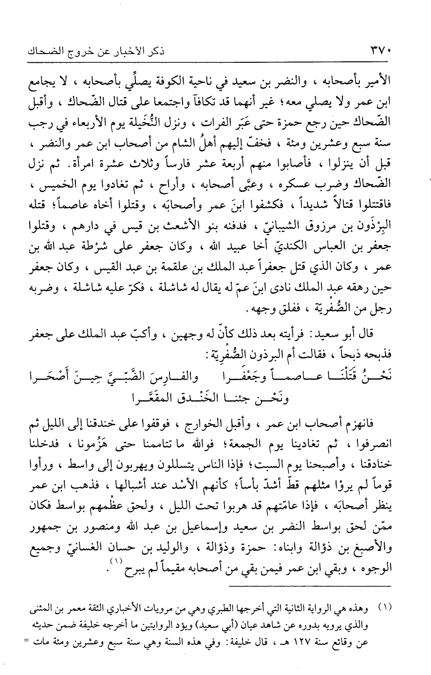 (١) وهذه هي الرواية الثانية التي أخرجها الطبري وهي من مرويات الأخباري الثقة معمر بن المثنى والذي يرويه بدوره عن شاهد عيان (أبي سعيد) ويؤيد الروايتين ما أخرجه خليفة ضمن حديثه عن وقائع سنة ١٢٧ هـ، قال خليفة: وفي هذه السنة وهي سنة سبع وعشرين ومئة مات =