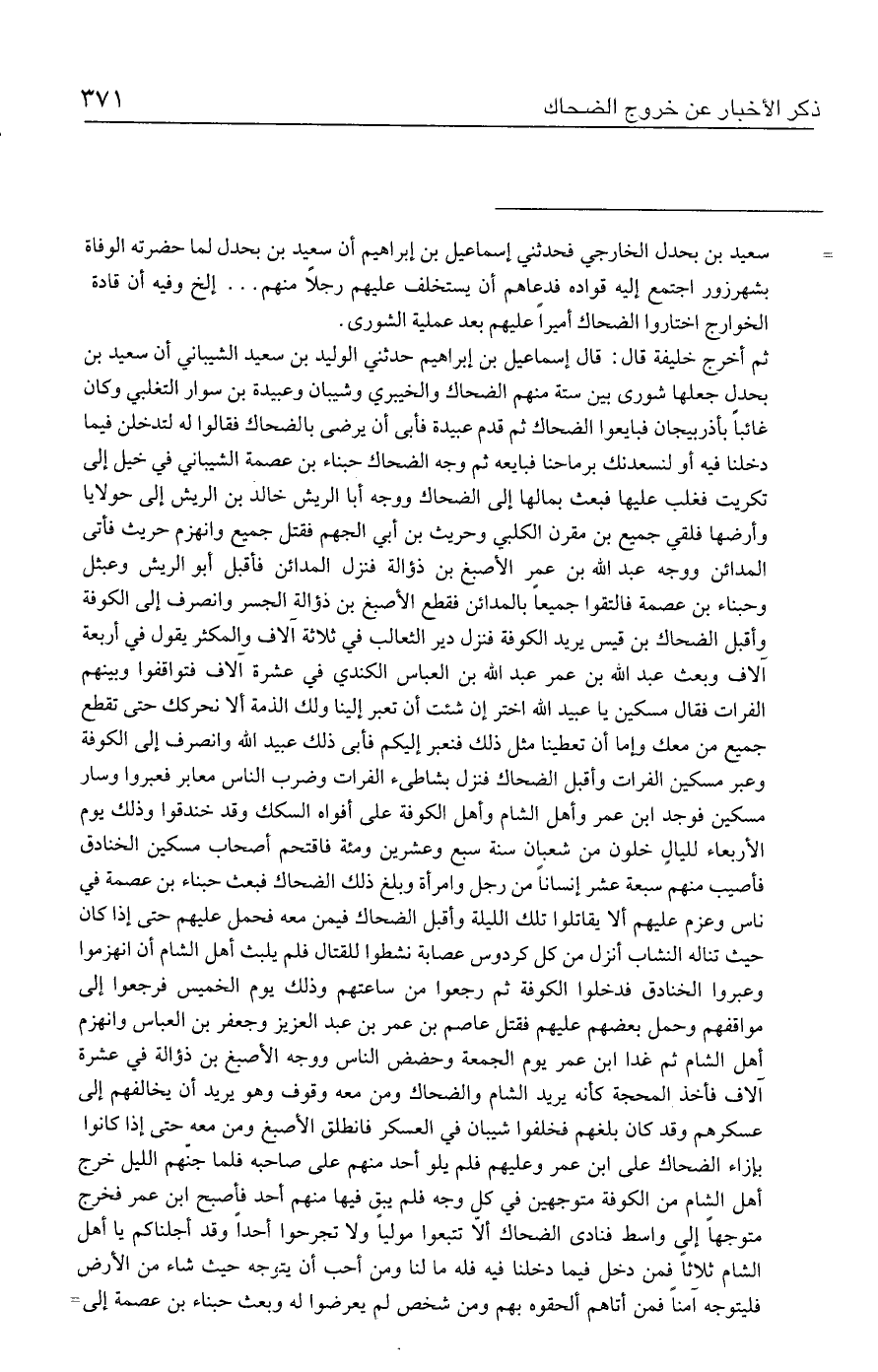 ثم أخرج خليفة قال: قال إسماعيل بن إبراهيم حدثني الوليد بن سعيد الشيباني أن سعيد بن بحدل جعلها شورى بين ستة منهم الضحاك والخيبري وشيبان وعبيدة بن سوار التغلبي وكان غائبًا بأذربيجان فبايعوا الضحاك ثم قدم عبيدة فأبى أن يرضى بالضحاك فقالوا له لتدخلن فيما دخلنا فيه أو لنسعدنك برماحنا فبايعه ثم وجه الضحاك حبناء بن عصمة الشيباني في خيل إلى تكريت فغلب عليها فبعث بمالها إلى الضحاك ووجه أبا الريش خالد بن الريش إلى حولايا وأرضها فلقي جميع بن مقرن الكلبي وحريث بن أبي الجهم فقتل جميع وانهزم حريث فأتى المدائن ووجه عبد الله بن عمر الأصبغ بن ذؤالة فنزل المدائن فأقبل أبو الريش وعبثل وحبناء بن عصمة فالتقوا جميعًا بالمدائن فقطع الأصبغ بن ذؤالة الجسر وانصرف إلى الكوفة وأقبل الضحاك بن قيس يريد الكوفة فنزل دير الثعالب في ثلاثة آلاف والمكثر يقول في أربعة آلاف وبعث عبد الله بن عمر عبد الله بن العباس الكندي في عشرة آلاف فتواقفوا وبينهم الفرات فقال مسكين يا عبيد الله اختر إن شئت أن تعبر إلينا ولك الذمة ألا نحركك حتى تقطع جميع من معك وإما أن تعطينا مثل ذلك فنعبر إليكم فأبى ذلك عبيد الله وانصرف إلى الكوفة وعبر مسكين الفرات وأقبل الضحاك فنزل بشاطئ الفرات وضرب الناس معابر فعبروا وسار مسكين فوجد ابن عمر وأهل الشام وأهل الكوفة على أفواه السكك وقد خندقوا وذلك يوم الأربعاء لليالٍ خلون من شعبان سنة سبع وعشرين ومئة فاقتحم أصحاب مسكين الخنادق فأصيب منهم سبعة عشر إنسانًا من رجل وامرأة وبلغ ذلك الضحاك فبعث حبناء بن عصمة في ناس وعزم عليهم ألا يقاتلوا تلك الليلة وأقبل الضحاك فيمن معه فحمل عليهم حتى إذا كان حيث تناله النشاب أنزل من كل كردوس عصابة نشطوا للقتال فلم يلبث أهل الشام أن انهزموا وعبروا الخنادق فدخلوا الكوفة ثم رجعوا من ساعتهم وذلك يوم الخميس فرجعوا إلى مواقفهم وحمل بعضهم عليهم فقتل عاصم بن عمر بن عبد العزيز وجعفر بن العباس وانهزم أهل الشام ثم غدا ابن عمر يوم الجمعة وحضض الناس ووجه الأصبغ بن ذؤالة في عشرة آلاف فأخذ المحجة كأنه يريد الشام والضحاك ومن معه وقوف وهو يريد أن يخالفهم إلى عسكرهم وقد كان بلغهم فخلفوا شيبان في العسكر فانطلق الأصبغ ومن معه حتى إذا كانوا بإزاء الضحاك على ابن عمر وعليهم فلم يلو أحد منهم على صاحبه فلما جنّهم الليل خرج أهل الشام من الكوفة متوجهين في كل وجه فلم يبقٍ فيها منهم أحد فأصبح ابن عمر فخرج متوجهًا إلى واسط فنادى الضحاك ألا تتبعوا موليًا ولا تجرحوا أحدًا وقد أجلناكم يا أهل الشام ثلاثًا فمن دخل فيما دخلنا فيه فله ما لنا ومن أحب أن يتوجه حيث شاء من الأرض فليتوجه آمنًا فمن أتاهم ألحقوه بهم ومن شخص لم يعرضوا له وبعث حبناء بن عصمة إلى =