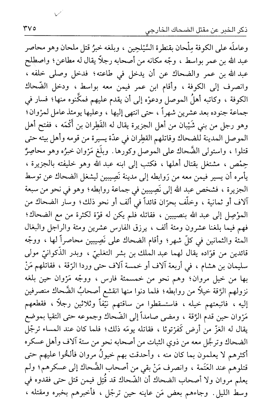 وعاملَه على الكوفة مِلْحان بقنطرة السَّيلحِين، وبلغه خبرُ قتل ملحان وهو محاصر عبد الله بن عمر بواسط، وجّه مكانه من أصحابه رجلًا يقال له مطاعن؛ واصطلح عبد الله بن عمر والضحاك عن أن يدخل في طاعته، فدخل وصلى خلفه، وانصرف إلى الكوفة، وأقام ابن عمر فيمن معه بواسط، ودخل الضّحاك الكوفة، وكاتبه أهلُ الموصل ودعوْه إلى أن يقدم عليهم فمكَّنوه منها؛ فسار في جماعة جنوده بعد عشرين شهرًا، حتى انتهى إليها، وعليها يومئذ عامل لمرْوان؛ وهو رجل من بني شَيبان من أهل الجزيرة يقال له القَطِران بن أَكْمَه، ففتح أهل الموصل المدينة للضحاك وقاتلهم القطِران في عدّة يسيرة من قومه وأهل بيته حتى قتلوا، واستولى الضَّحاك على الموصل وكورها. وبلَغ مَرْوان خبرُه وهو محاصِرٌ حِمْص، مشتغل بقتال أهلها، فكتب إلى ابنه عبد الله وهو خليفته بالجزيرة، يأمره أن يسير فيمن معه من رَوابطه إلى مدينة نَصِيبين ليشغل الضحاك عن توسط الجزيرة، فشخص عبد الله إلى نصِيبين في جماعة روابطه، وهو في نحو من سبعة آلاف أو ثمانية، وخلّف بحزان قائدًا في ألف أو نحو ذلك، وسار الضحاك من الموْصل إلى عبد الله بنصيبين، فقاتله فلم يكن له قوّة لكثرة من مع الضحاك؛ فهم فيما بلغنا عشرون ومئة ألف، يرزق الفارس عشرين ومئة والراجل والبغال المئة والثمانين في كلّ شهر؛ وأقام الضحاك على نَصِيبين محاصرًا لها، ووجّه قائدين من قوّاده يقال لهما عبد الملك بن بشر التغلبيّ، وبدر الذّكوانيّ مولى سليمان بن هشام، في أربعة آلاف أو خمسة آلاف حتى وردا الرّقة، فقاتلهم مَنْ بها من خيل مروان؛ وهم نحو من خمسمئة فارس، ووجّه مَرْوان حين بلغه نزولهم الرَّقة خيلًا من روابطه، فلما دنوا منها انقشع أصحابُ الضَّحاك منصرفين إليه، فاتبعتهم خيله، فاستسقطوا من ساقتهم نيّفًا وثلاثين رجلًا، فقطعهم مَرْوان حين قدم الزَقة، ومضى صامدًا إلى الضحاك وجموعه حتى التقيا بموضع يقال له الغزّ من أرض كَفرْتوثا، فقاتله يومَه ذلك؛ فلما كان عند المساء ترجّل الضحاك وترجَّل معه من ذوي الثبات من أصحابه نحو من ستة آلاف وأهل عسكره أكثرهم لا يعلمون بما كان منه، وأحدقت بهم خيولُ مروان فألحُّوا عليهم حتى قتلوهم عند العَتَمة، وانصرف مَنْ بقي من أصحاب الضَّحاك إلى عسكرهم، ولم يعلم مروان ولا أصحاب الضحاك أن الضّحاك قد قُتِل فيمن قتل حتى فقدوه في وسط الليل. وجاءهم بعض مَن عاينه حين ترجّل، فأخبرهم بخبره ومقتله،