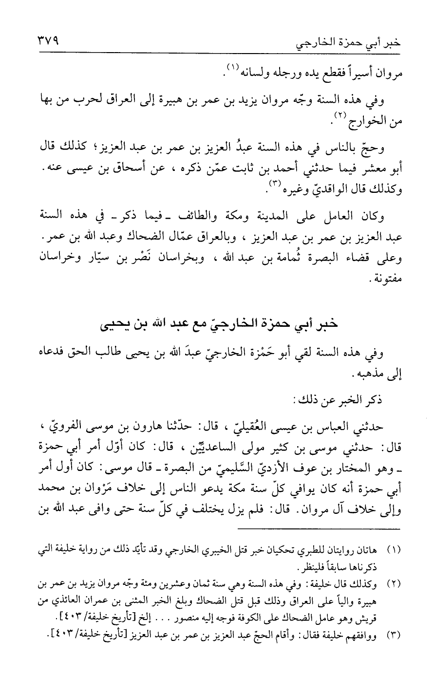 (١) هاتان روايتان للطبري تحكيان خبر قتل الخيبري الخارجي وقد تأيّد ذلك من رواية خليفة التي ذكرناها سابقًا فلينظر.