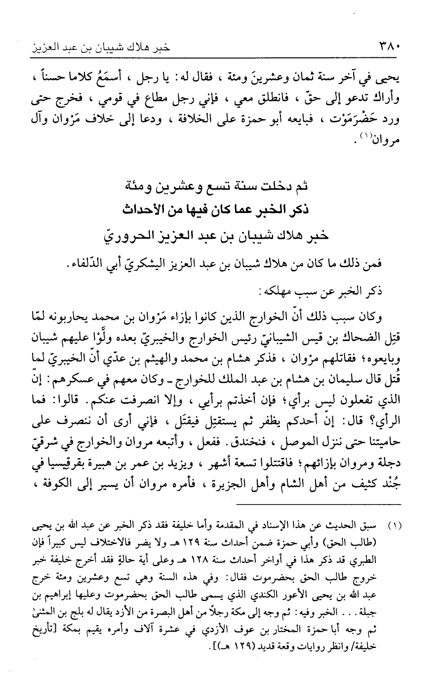 (١) سبق الحديث عن هذا الإسناد في المقدمة وأما خليفة فقد ذكر الخبر عن عبد الله بن يحيى (طالب الحق) وأبي حمزة ضمن أحداث سنة ١٢٩ هـ ولا يضر فالاختلاف ليس كبيرًا فإن الطبري قد ذكر هذا في أواخر أحداث سنة ١٢٨ هـ وعلى أية حالةٍ فقد أخرج خليفة خبر خروج طالب الحق بحضرموت فقال: وفي هذه السنة وهي تسع وعشرين ومئة خرج عبد الله بن يحيى الأعور الكندي الذي يسمى طالب الحق بحضرموت وعليها إبراهيم بن جبلة ... الخبر وفيه: ثم وجه إلى مكة رجلًا من أهل البصرة من الأزد يقال له بلج بن المثنى ثم وجه أبا حمزة المختار بن عوف الأزدي في عشرة آلاف وأمره يقيم بمكة [تأريخ خليفة / وانظر روايات وقعة قديد (١٢٩ هـ)].