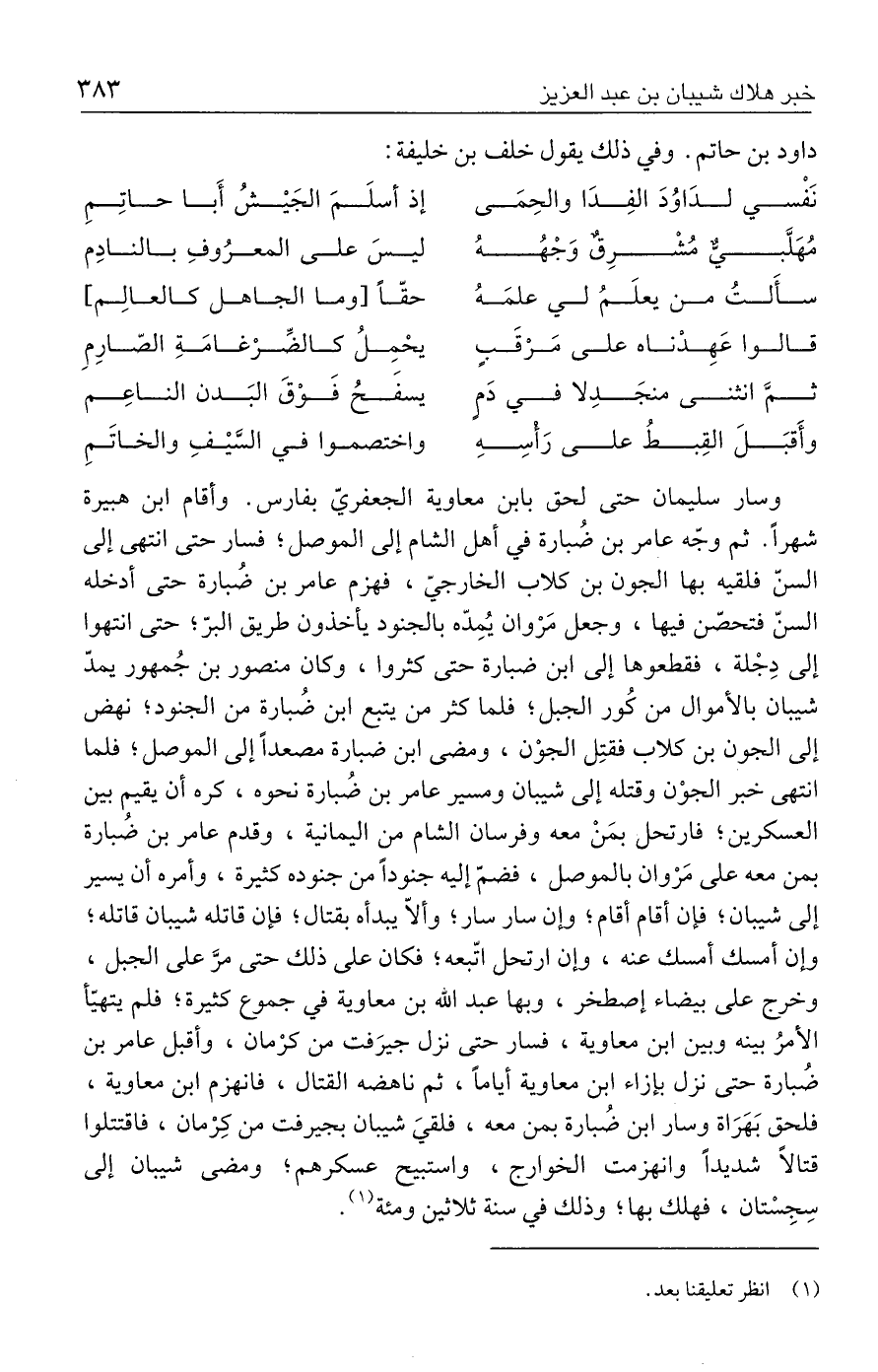 وسار سليمان حتى لحق بابن معاوية الجعفريّ بفارس. وأقام ابن هبيرة شهرًا. ثم وجّه عامر بن ضُبارة في أهل الشام إلى الموصل؛ فسار حتى انتهى إلى السن فلقيه بها الجون بن كلاب الخارجيّ، فهزم عامر بن ضُبارة حتى أدخله السنّ فتحصّن فيها، وجعل مَرْوان يُمِدّه بالجنود يأخذون طريق البرّ؛ حتى انتهوا إلى دِجْلة، فقطعوها إلى ابن ضُبارة حتى كثروا، وكان منصور بن جُمهور يمدّ شيبان بالأموال من كُور الجبل؛ فلما كثر من يتبع ابن ضُبارة من الجنود؛ نهض إلى الجون بن كلاب فقتِل الجوْن، ومضى ابن ضُبارة مصعدًا إلى الموصل؛ فلما انتهى خبر الجوْن وقتله إلى شيبان ومسير عامر بن ضُبارة نحوه، كره أن يقيم بين العسكرين؛ فارتحل بمَنْ معه وفرسان الشام من اليمانية، وقدم عامر بن ضُبارة بمن معه على مَرْوان بالموصل، فضمّ إليه جنودًا من جنوده كثيرة، وأمره أن يسير إلى شيبان؛ فإن أقام أقام؛ وإن سار سار؛ وألّا يبدأه بقتال؛ فإن قاتله شيبان قاتله؛ وإن أمسك أمسك عنه، وإن ارتحل اتّبعه؛ فكان على ذلك حتى مرَّ على الجبل، وخرج على بيضاء إصطخر، وبها عبد الله بن معاوية في جموع كثيرة؛ فلم يتهيّأ الأمرُ بينه وبين ابن معاوية، فسار حتى نزل جيرَفت من كرْمان، وأقبل عامر بن ضُبارة حتى نزل بإزاء ابن معاوية أيامًا، ثم ناهضه القتال، فانهزم ابن معاوية، فلحق بَهَرَاة وسار ابن ضُبارة بمن معه، فلقيَ شيبان بجيرفت من كِرْمان، فاقتتلوا قتالًا شديدًا وانهزمت الخوارج، واستبيح عسكرهم؛ ومضى شيبان إلى سِجِسْتان، فهلك بها؛ وذلك في سنة ثلاثين ومئة (١).