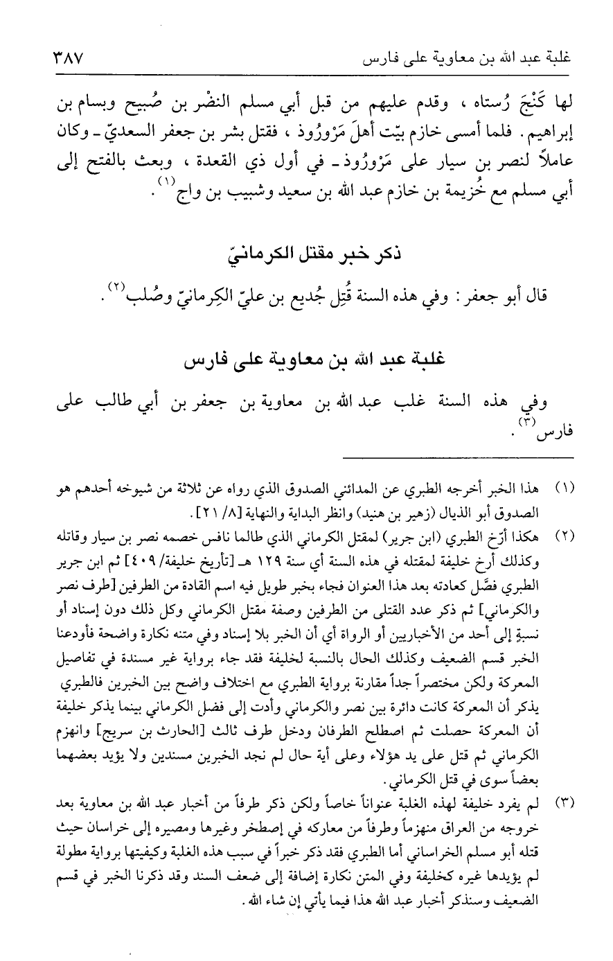 (٢) هكذا أرّخ الطبري (ابن جرير) لمقتل الكرماني الذي طالما نافس خصمه نصر بن سيار وقاتله وكذلك أرخ خليفة لمقتله في هذه السنة أي سنة ١٢٩ هـ[تأريخ خليفة / ٤٠٩] ثم ابن جرير الطبري فصَّل كعادته بعد هذا العنوان فجاء بخبر طويل فيه اسم القادة من الطرفين [طرف نصر والكرماني] ثم ذكر عدد القتلى من الطرفين وصفة مقتل الكرماني وكل ذلك دون إسناد أو نسبةٍ إلى أحد من الأخبارين أو الرواة أي أن الخبر بلا إسناد وفي متنه نكارة واضحة فأودعنا الخبر قسم الضعيف وكذلك الحال بالنسبة لخليفة فقد جاء برواية غير مسندة في تفاصيل المعركة ولكن مختصرًا جدًّا مقارنة برواية الطبري مع اختلاف واضح بين الخبرين فالطبري يذكر أن المعركة كانت دائرة بين نصر والكرماني وأدت إلى فضل، الكرماني بينما يذكر خليفة أن المعركة حصلت ثم اصطلح الطرفان ودخل طرف ثالث [الحارث بن سريج] وانهزم الكرماني ثم قتل على يد هؤلاء وعلى أية حال لم نجد الخبرين مسندين ولا يؤيد بعضهما بعضًا سوى في قتل الكرماني.