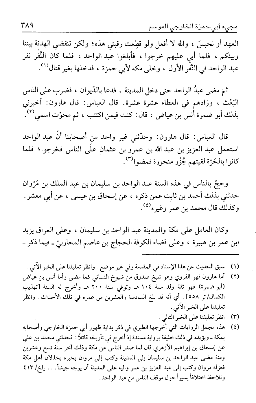 (٤) هذه مجمل الروايات التي أخرجها الطبري في ذكر بداية ظهور أبي حمزة الخارجي وأصحابه بمكة - ويؤيده في ذلك خليفة برواية مسندة إذ أخرج في تأريخه قائلًا: فحدثني محمد بن علي عن إسحاق بن إبراهيم الأزهري قال لما صدر الناس عن مكة وذلك آخر سنة تسع وعشرين ومئة مضى عبد الواحد بن سليمان إلى المدينة وكتب إلى مروان يخبره بخذلان أهل مكة فعزله مروان وكتب إلى عبد العزيز بن عمر وإليه على المدينة أن يوجه جيشًا ... إلح / ٤١٣ ونلاحظ اختلافًا يسيرًا حول موقف الناس من عبد الواحد.