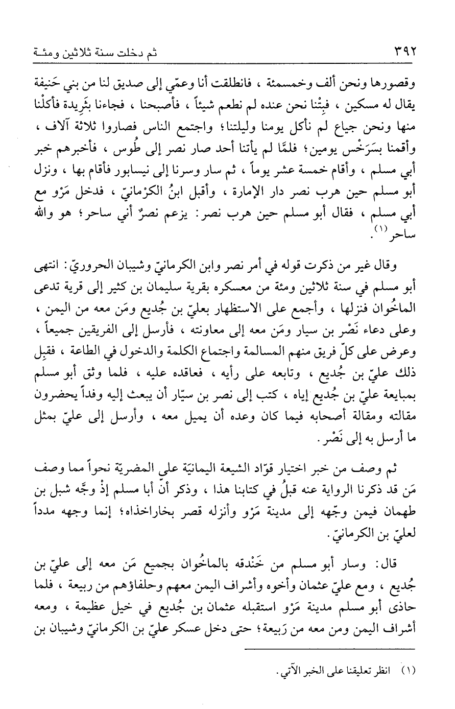 وقصورها ونحن ألف وخمسمئة، فانطلقت أنا وعمّي إلى صديق لنا من بني حَنيفة يقال له مسكين، فبِتْنا نحن عنده لم نطعم شيئًا، فأصبحنا، فجاءنا بثَرِيدة فأكلْنا منها ونحن جياع لم نأكل يومنا وليلتنا، واجتمع الناس فصاروا ثلاثة آلاف، وأقمنا بسَرَخْس يومين؛ فلمَّا لم يأتنا أحد صار نصر إلى طُوس، فأخبرهم خبر أبي مسلم، وأقام خمسة عشر يومًا، ثم سار وسرنا إلى نيسابور فأقام بها، ونزل أبو مسلم حين هرب نصر دار الإمارة، وأقبل ابنُ الكرْمانيّ، فدخل مَرْو مع أبي مسلم، فقال أبو مسلم حين هرب نصر: يزعم نصرٌ أني ساحر؛ هو والله ساحر (١).