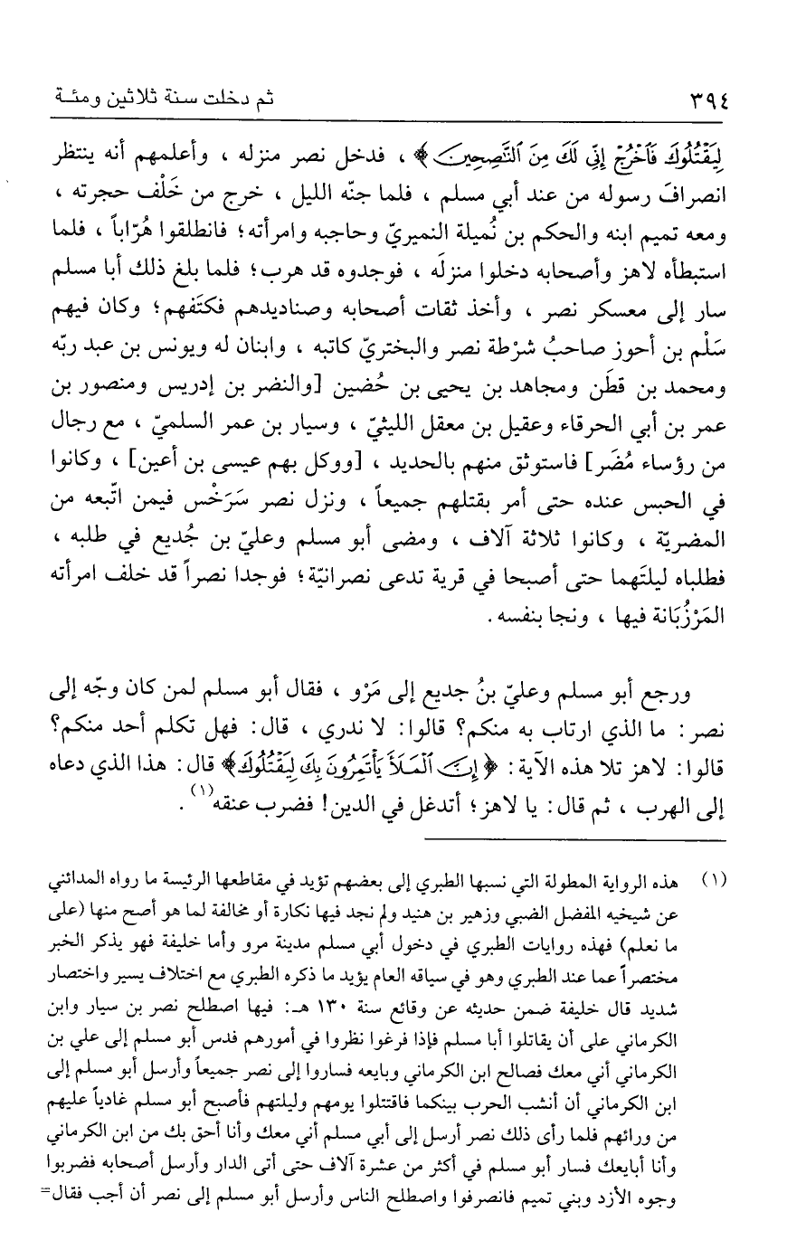 (١) هذه الرواية المطولة التي نسبها الطبري إلى بعضهم نؤيد في مقاطعها الرئيسة ما رواه المدائني عن شيخيه المفضل الضبي وزهير بن هنيد ولم نجد فيها نكارة أو مخالفة لما هو أصح منها (على ما نعلم) فهذه روايات الطبري في دخول أبي مسلم مدينة مرو وأما خليفة فهو يذكر الخبر مختصرًا عما عند الطبري وهو في سياقه العام يؤيد ما ذكره الطبري مع اختلاف يسير واختصار شديد قال خليفة ضمن حديثه عن وقائع سنة ١٣٠ هـ: فيها اصطلح نصر بن سيار وابن الكرماني على أن يقاتلوا أبا مسلم فإذا فرغوا نظروا في أمورهم فدس أبو مسلم إلى علي بن الكرماني أني معك فصالح ابن الكرماني وبايعه فساروا إلى نصر جميعًا وأرسل أبو مسلم إلى ابن الكرماني أن أنشب الحرب بينكما فاقتنلوا يومهم وليلتهم فأصبح أبو مسلم غاديًا عليهم من ورائهم فلما رأى ذلك نصر أرسل إلى أبي مسلم أني معك وأنا أحق بك من ابن الكرماني وأنا أبايعك فسار أبو مسلم في أكثر من عشرة آلاف حتى أتى الدار وأرسل أصحابه فضربوا وجوه الأزد وبني تميم فانصرفوا واصطلح الناس وأرسل أبو مسلم إلى نصر أن أجب فقال =