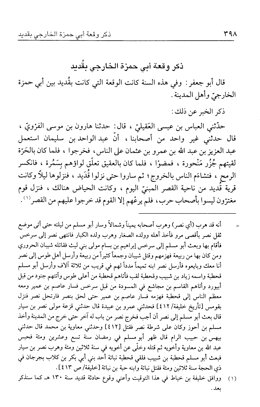 قال أبو جعفر: وفي هذه السنة كانت الوقعة التي كانت بقُديد بين أبي حمزة الخارجيّ وأهل المدينة.