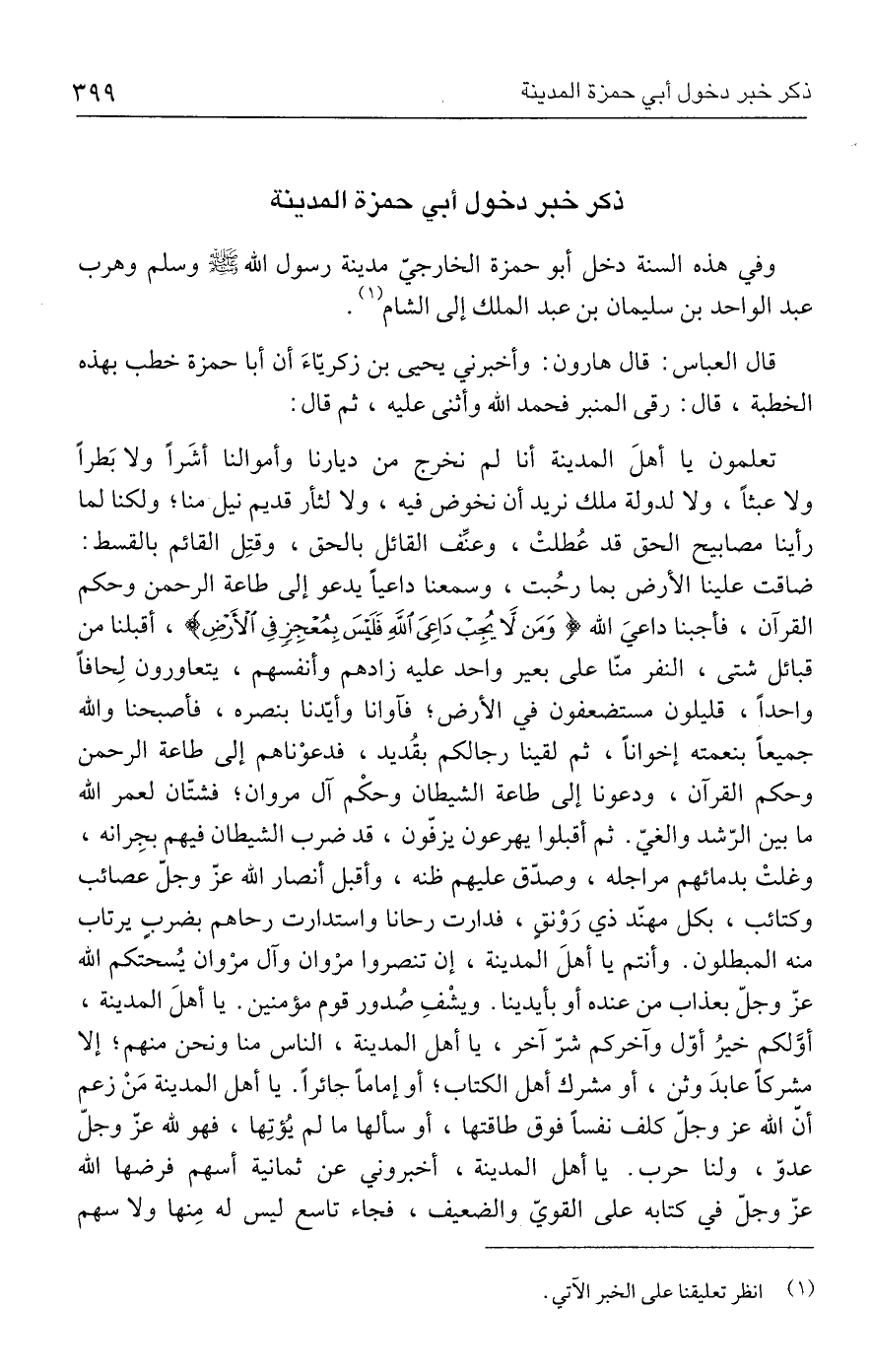 تعلمون يا أهلَ المدينة أنا لم نخرج من ديارنا وأموالنا أشَرًا ولا بَطرًا ولا عبثًا، ولا لدولة ملك نريد أن نخوض فيه، ولا لثأر قديم نيل منا؛ ولكنا لما رأينا مصابيح الحق قد عُطلتْ، وعنِّف القائل بالحق، وقتِل القائم بالقسط: ضاقت علينا الأرض بما رحُبت، وسمعنا داعيًا يدعو إلى طاعة الرحمن وحكم القرآن، فأجبنا داعيَ الله {وَمَنْ لَا يُجِبْ دَاعِيَ اللَّهِ فَلَيسَ بِمُعْجِزٍ فِي الْأَرْضِ}، أقبلنا من قبائل شتى، النفر منّا على بعير واحد عليه زادهم وأنفسهم، يتعاورون لِحافًا واحدًا، قليلون مستضعفون في الأرض؛ فآوانا وأيّدنا بنصره، فأصبحنا والله جميعًا بنعمته إخوانًا، ثم لقينا رجالكم بقُديد، فدعوْناهم إلى طاعة الرحمن وحكم القرآن، ودعونا إلى طاعة الشيطان وحكْم آل مروان؛ فشتّان لعمر الله ما بين الرّشد والغيّ. ثم أقبلوا يهرعون يزفّون، قد ضرب الشيطان فيهم بجِرانه، وغلتْ بدمائهم مراجله، وصدّق عليهم ظنه، وأقبل أنصار الله عزّ وجلّ عصائب وكتائب، بكل مهنّد ذي رَوْنقٍ، فدارت رحانا واستدارت رحاهم بضربٍ يرتاب منه المبطلون. وأنتم يا أهلَ المدينة، إن تنصروا مرْوان وآل مرْوان يُسحتكم الله عزّ وجلّ بعذاب من عنده أو بأيدينا. ويشْفِ صُدور قوم مؤمنين. يا أهلَ المدينة، أوَّلكم خيرُ أوّل وآخركم شرّ آخر، يا أهل المدينة، الناس منا ونحن منهم؛ إلا مشركًا عابدَ وثن، أو مشرك أهل الكتاب، أو إمامًا جائرًا. يا أهل المدينة مَنْ زعم أنّ الله عزَّ وجلَّ كلف نفسًا فوق طاقتها، أو سألها ما لم يُؤتِها، فهو لله عزّ وجلّ عدوّ، ولنا حرب. يا أهل المدينة، أخبروني عن ثمانية أسهم فرضها الله عزّ وجلّ في كتابه على القويّ والضعيف، فجاء تاسع ليس له مِنها ولا سهم