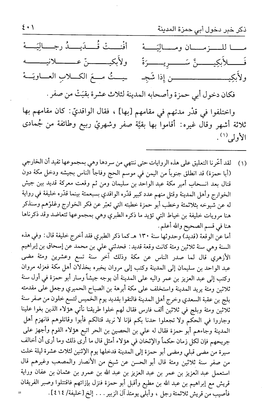 (١) لقد أخّرنا التعليق على هذه الروايات حتى ننتهي من سردها وهي بمجموعها تفيد أن الخارجي (أبا حمزة) قد انطلق جنوبًا من اليمن في موسم الحج وفاجأ الناس بجيشه ودخل مكة دون قتال بعد انسحاب أمير مكة عبد الواحد بن سليمان ومن ثم وقعت معركة قديد بين جيش الخوارج وأهل المدينة وقتل منهم عدد كبير قدّره الواقدي بسبعمئة بينما قدّره خليفة في رواية له عن شيوخه بثلاثمئة وخطب أبو حمزة خطبته التي تعبّر عن فكر الخوارج وغلوّهم وسنذكر هنا مرويات خليفة بن خياط التي تؤيد ما ذكره الطبري وهي بمجموعها تتعاضد وقد ذكرناها هنا في قسم الصحيح والله أعلم.