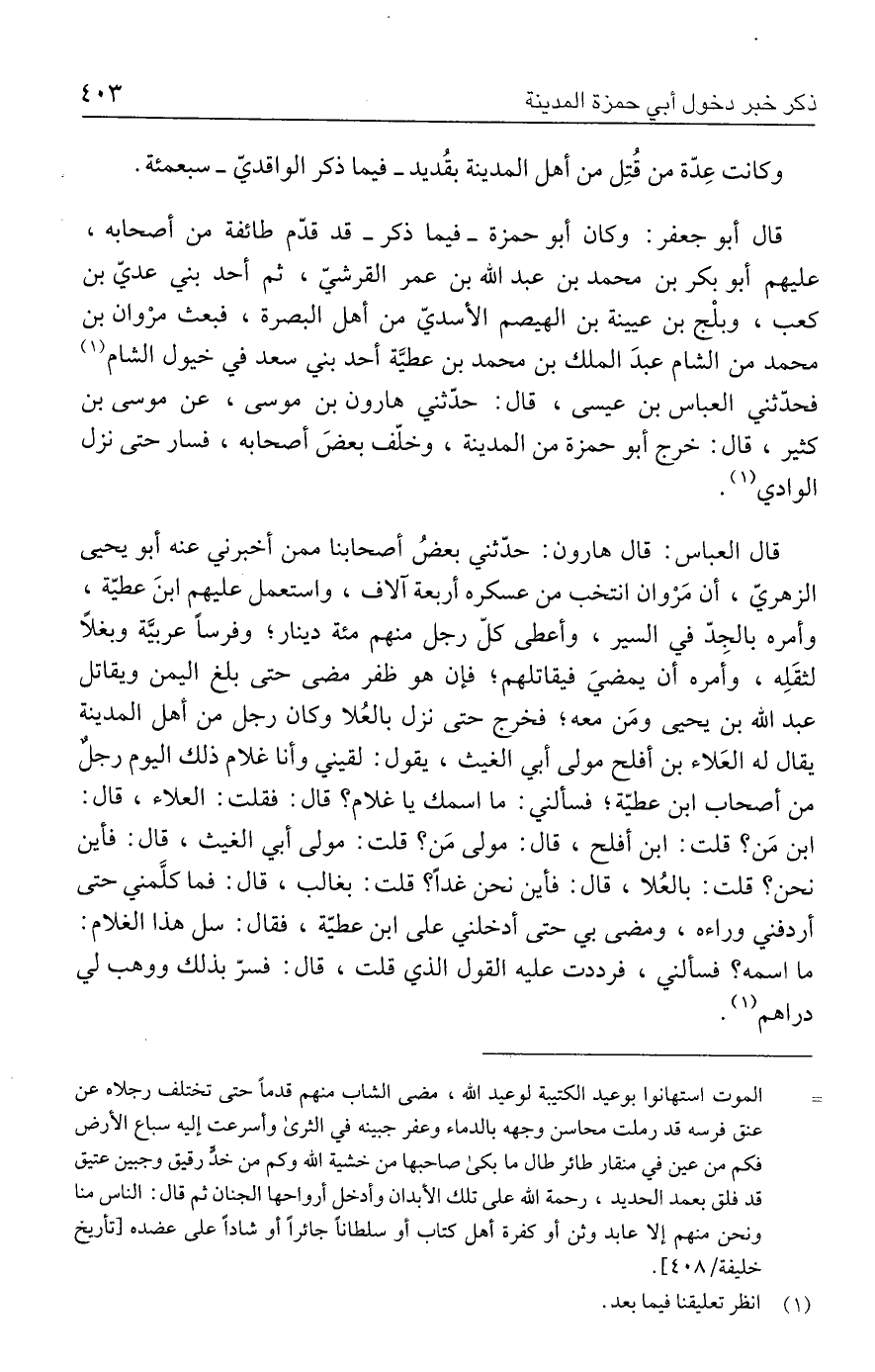 قال أبو جعفر: وكان أبو حمزة - فيما ذكر - قد قدّم طائفة من أصحابه، عليهم أبو بكر بن محمد بن عبد الله بن عمر القرشيّ، ثم أحد بني عديّ بن كدب، وبلْج بن عيينة بن الهيصم الأسديّ من أهل البصرة، فبعث مرْوان بن محمد من الشام عبدَ الملك بن محمد بن عطيَّة أحد بني سعد في خيول الشام (١) فحدّثني العباس بن عيسى، قال: حدّثني هارون بن موسى، عن موسى بن كثير، قال: خرج أبو حمزة من المدينة، وخلّف بعضَ أصحابه، فسار حتى نزل الوادي (١).