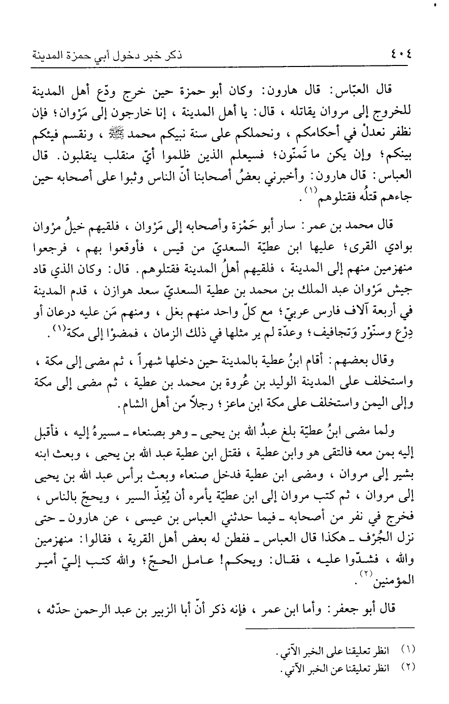 قال العبّاس: قال هارون: وكان أبو حمزة حين خرج ودّع أهل المدينة للخروج إلى مروان يقاتله، قال: يا أهل المدينة، إنا خارجون إلى مَرْوان؛ فإن نظفر نعدلْ في أحكامكم، ونحملكم على سنة نبيكم محمد - صلى الله عليه وسلم -، ونقسم فيئكم بينكم؛ وإن يكن ما تَمنّون؛ فسيعلم الذين ظلموا أيّ منقلب ينقلبون. قال العباس: قال هارون: وأخبرني بعضُ أصحابنا أنّ الناس وثبوا على أصحابه حين جاءهم قتلُه فقتلوهم (١).